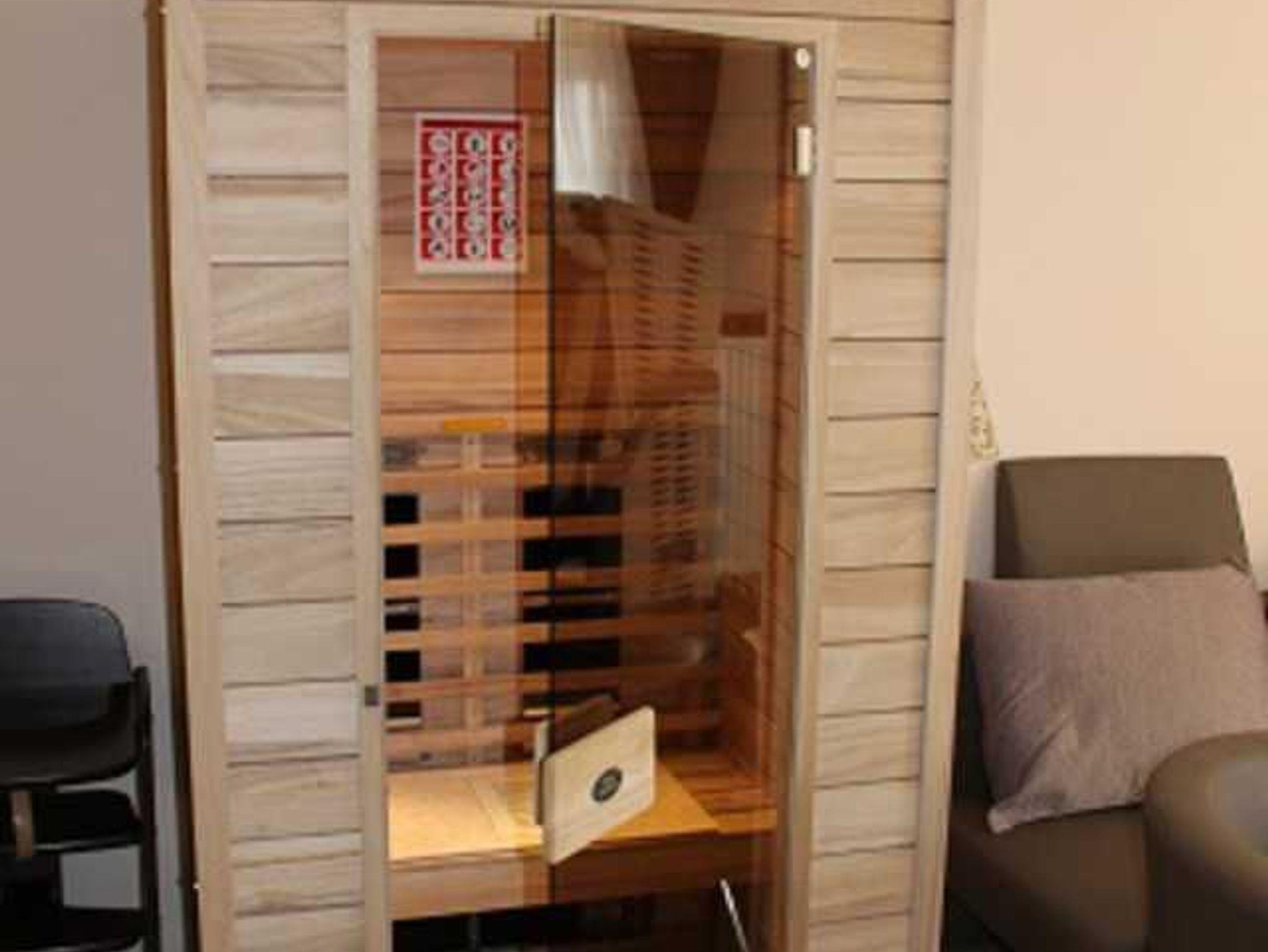 Infrarot Sauna Tiefenwärme(auch für Kleinkinder unter Aufsicht) mit Blick auf dem LCD TV im Wohnzimmer,