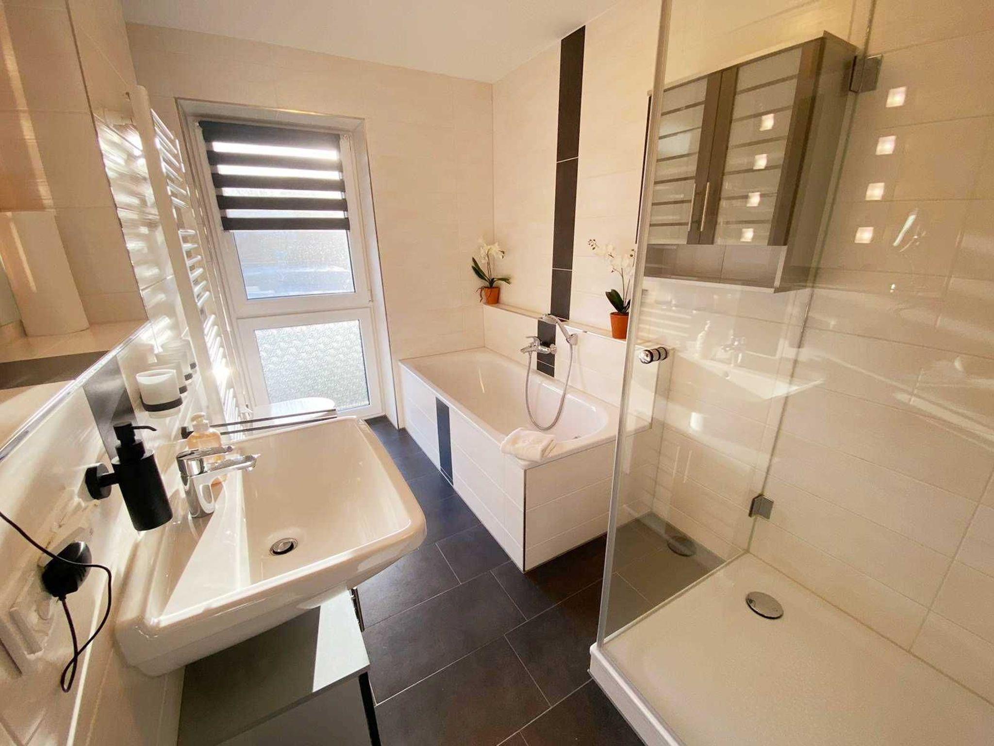 • Bad: mit Fenster, Dusche, Badewanne, Waschbecken, Toilette, Spiegelschrank, Unterschrank Waschbecken, Schrank (Handtücher liegen kostenlos für sie bereit, jeweils 1 Duschtuch und 1 Handtücher)