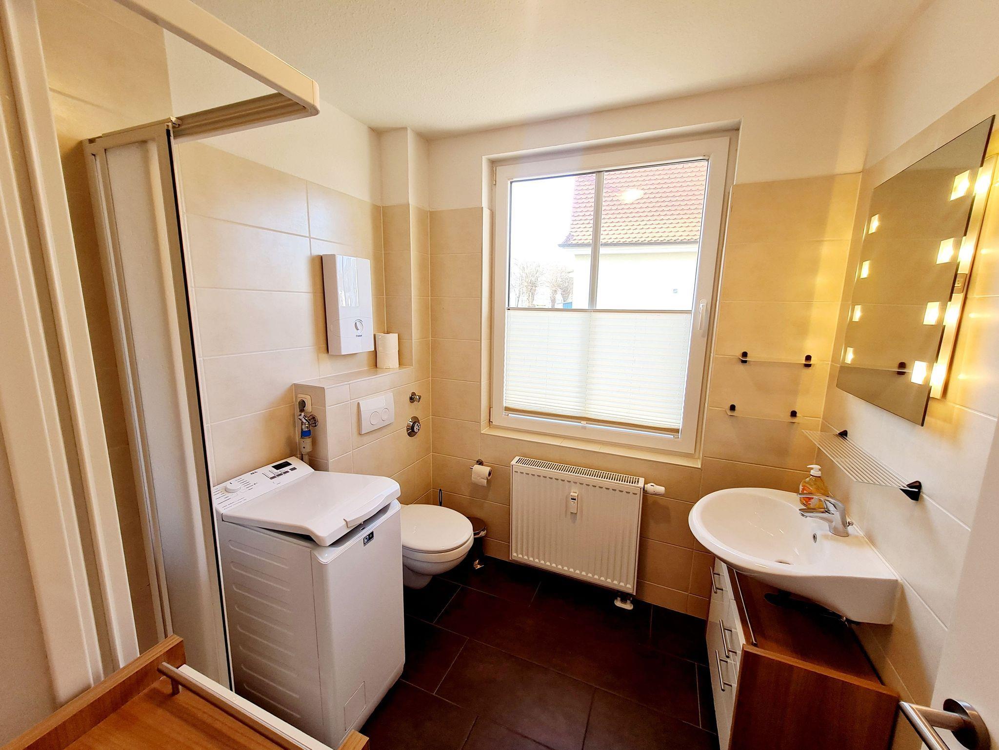 • Bad: mit Fenster, Dusche, Waschbecken, Toilette, Spiegel, Schrank, Unterschrank Waschbecken, Waschmaschine, Handtucheizkörper