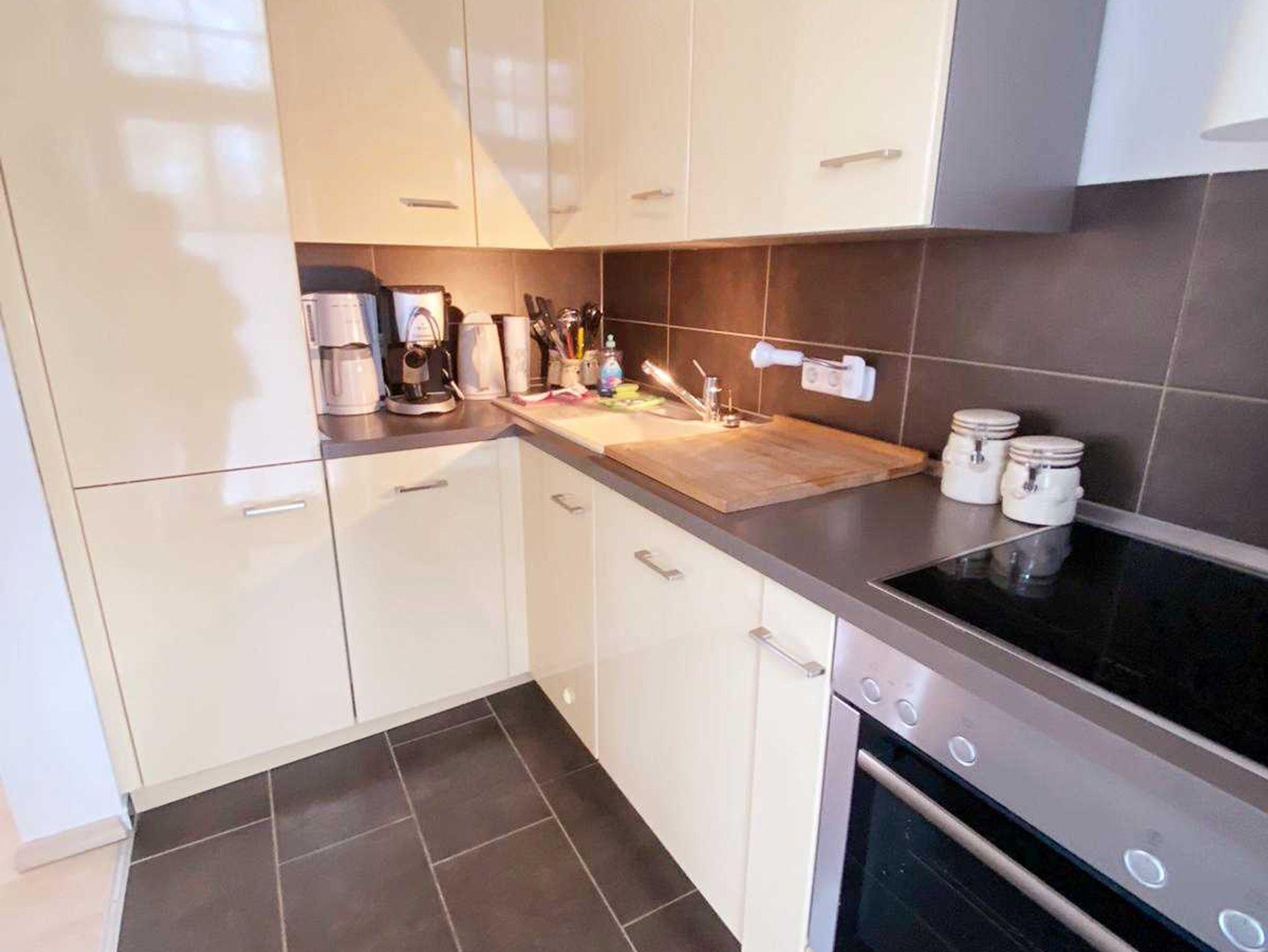 • Küche: Einbauküche mit komplettem Zubehör Cerankochfeld, Backofen, Geschirrspüler, Kühlschrank mit Gefrierschrank, Wasserkocher, Kaffeemaschine, Toaster