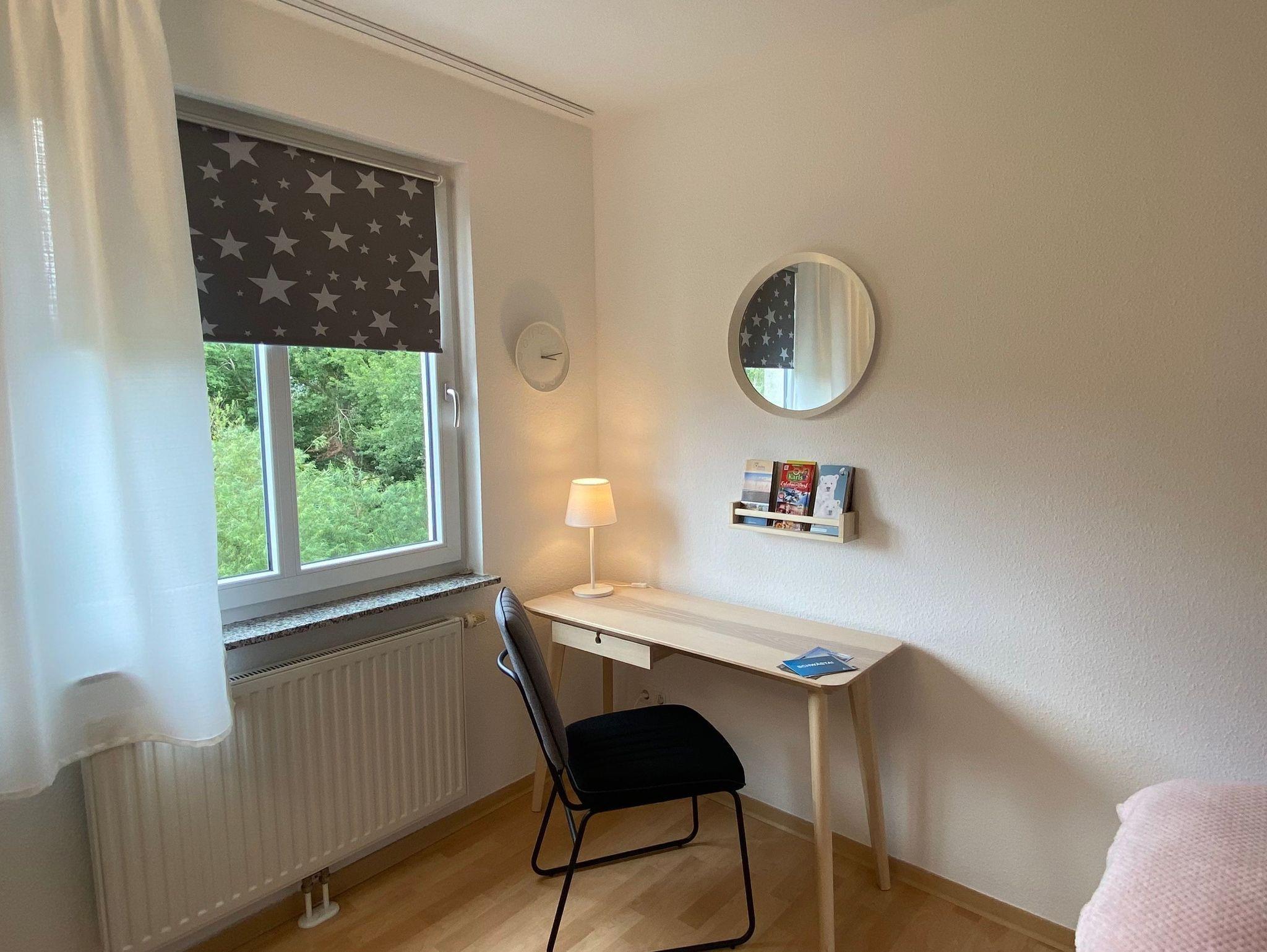 • Schlafzimmer II: Universal-Liege mit Ausziehfunktion: Einzelbett: 1,00 m breit x 2,00m lang, 2. Bett: ausziehbare Liegefläche 0,90 m x 1,90 m auf einer Ebene, Liegebreite für 2 Personen gesamt 1,90 m, Kleiner Schrank, kleine Hängegarderobe, Tisch und Stuhl, Kinderbücher, kleine Spiele, Verdunkelungsrollo, Fliegenschutzgitter