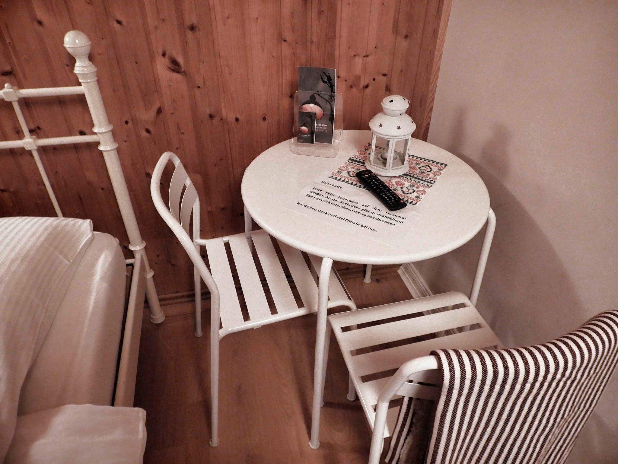 Das Ferienzimmer Moorhexe in Graal-Müritz bietet Ihnen ein Einzelbett, ein LCD-TV mit Satellitenempfang sowie einen Schrank und einen Tisch mit zwei Stühlen.