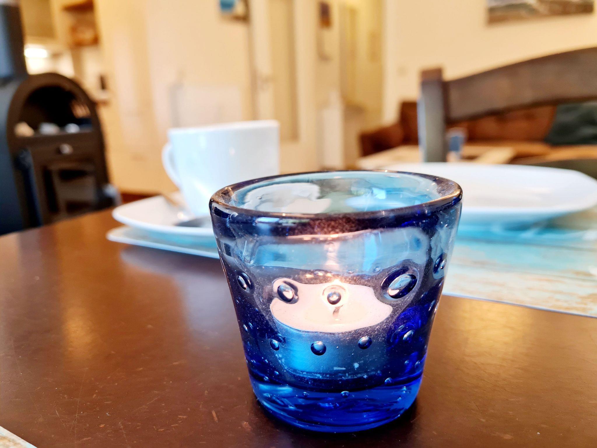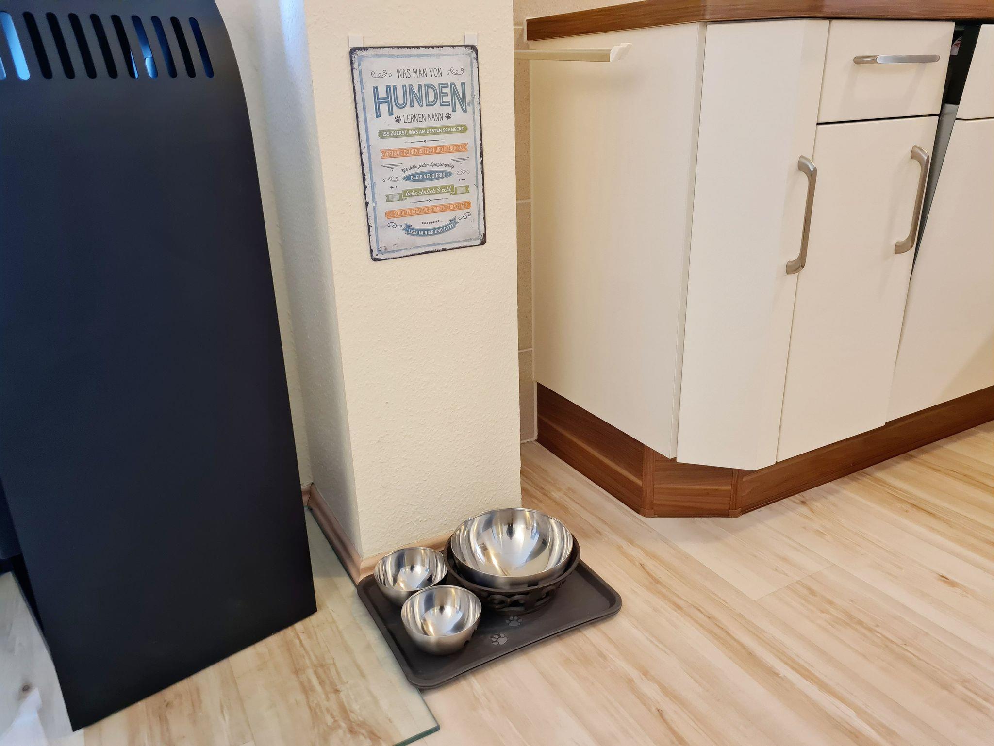 • Wohnzimmer: gemütliche Schlafcouch mit 130x200 cm, Flachbild-TV, TV-Bank, Tisch, direkter Zugang zum Westbalkon, Kaminofen, Plissees und Verdunklungsvorhänge
