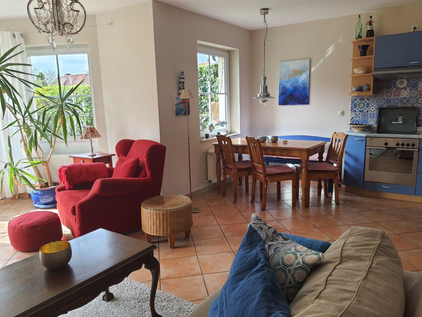 Das Wohnzimmer ist mit einer Couch, einem bequemen Sessel und einem TV eingerichtet, ein gemütlicher Essplatz gehört ebenfalls dazu.
