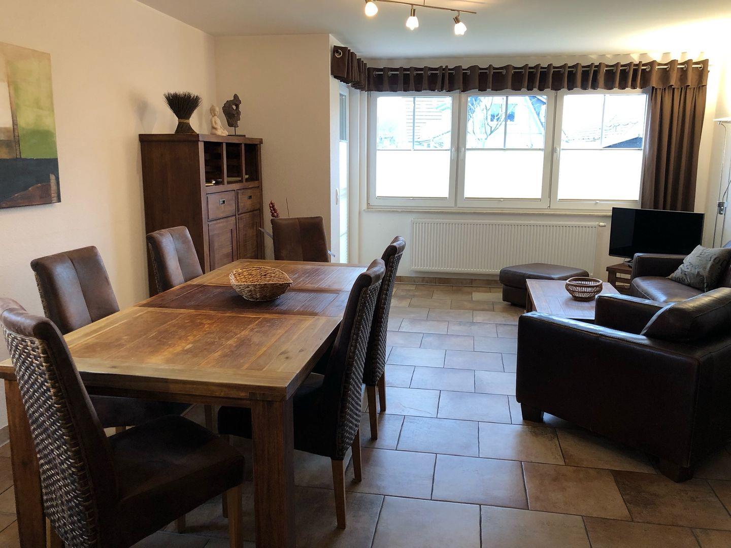 Der zur Küche offene Wohn-Essbereich ist mit TV und großem Esstisch ausgestattet. Ein behaglicher Kamin ergänzt das ruhige Ambiente.