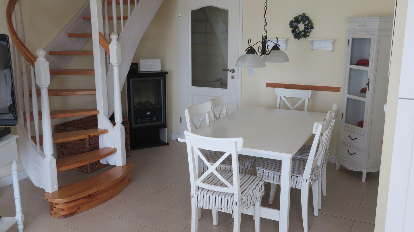 Die Ferienwohnung befindet sich im 2. Obergeschoß, offener Wohn-Eß-Küchenbereich mit Elektrokamin und vollausgestatteter Einbauküche und modernen, energieeffizienten Edelstahlgeräten.