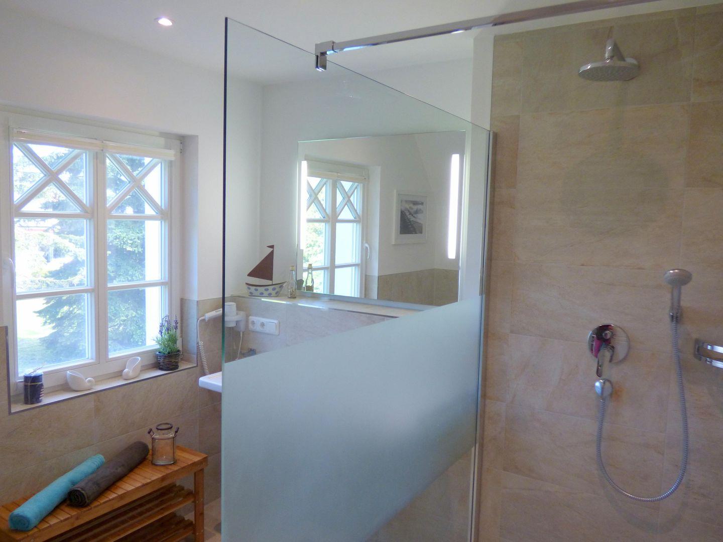 Das zweite Bad mit großer, offener Dusche bietet Freiheit auf der Etage.