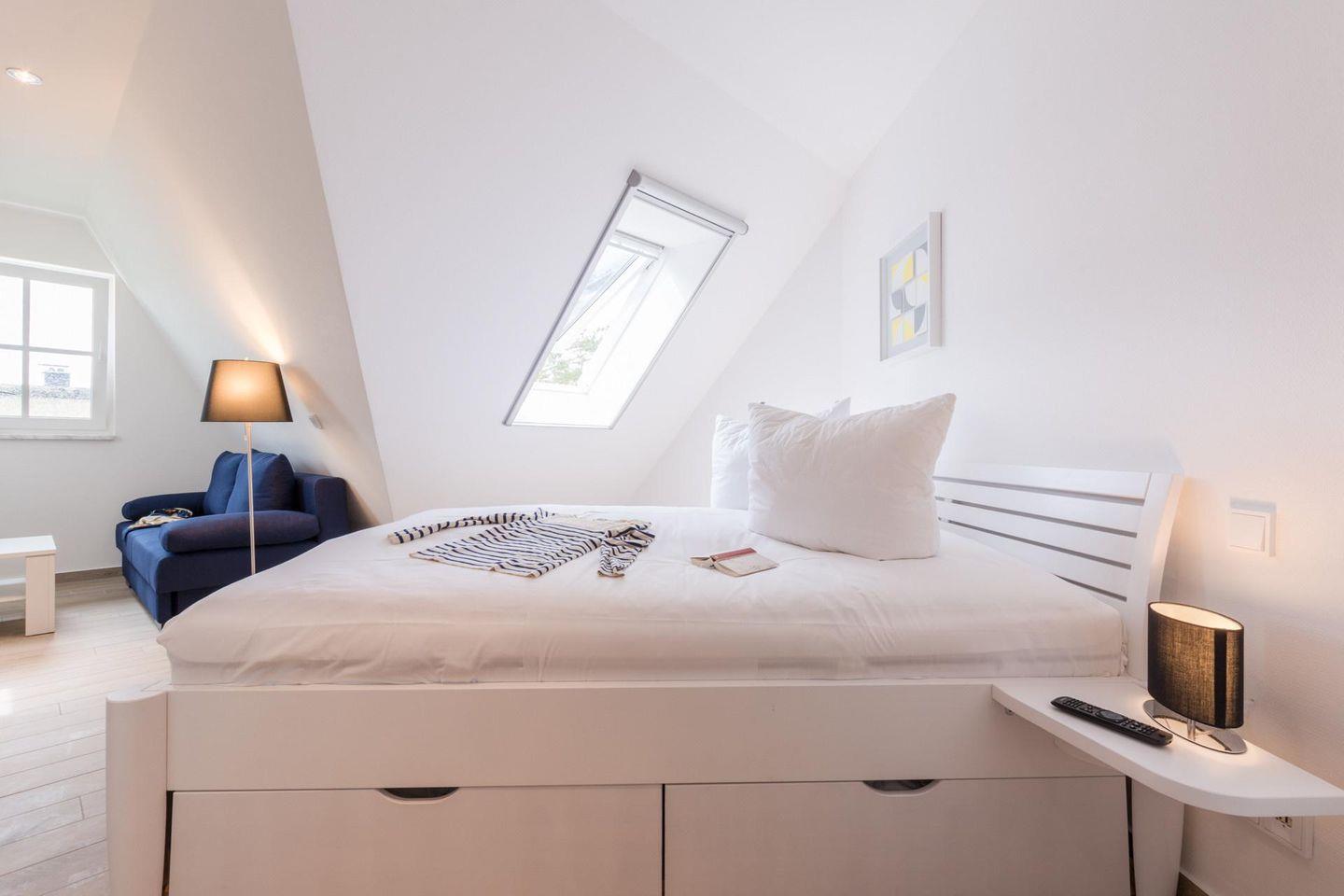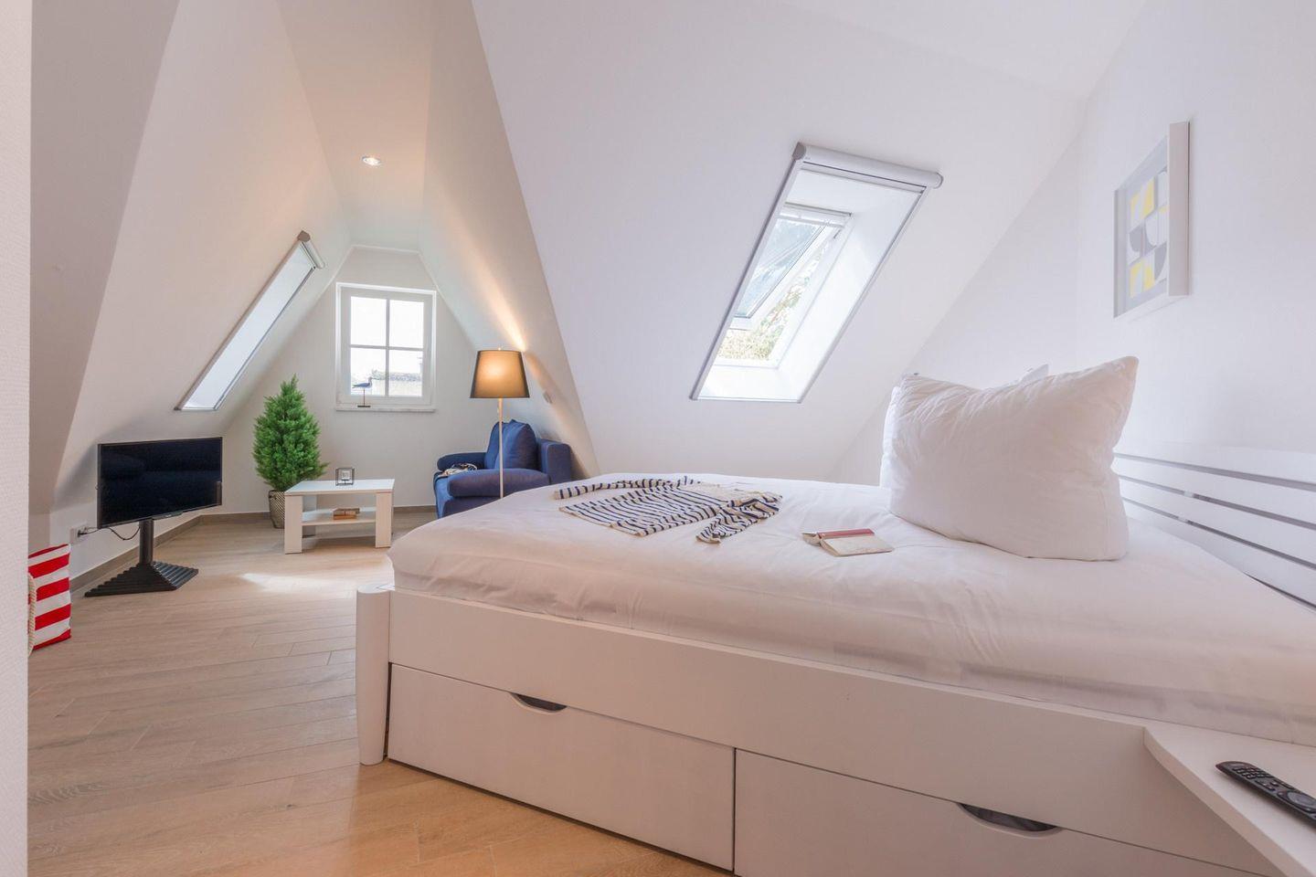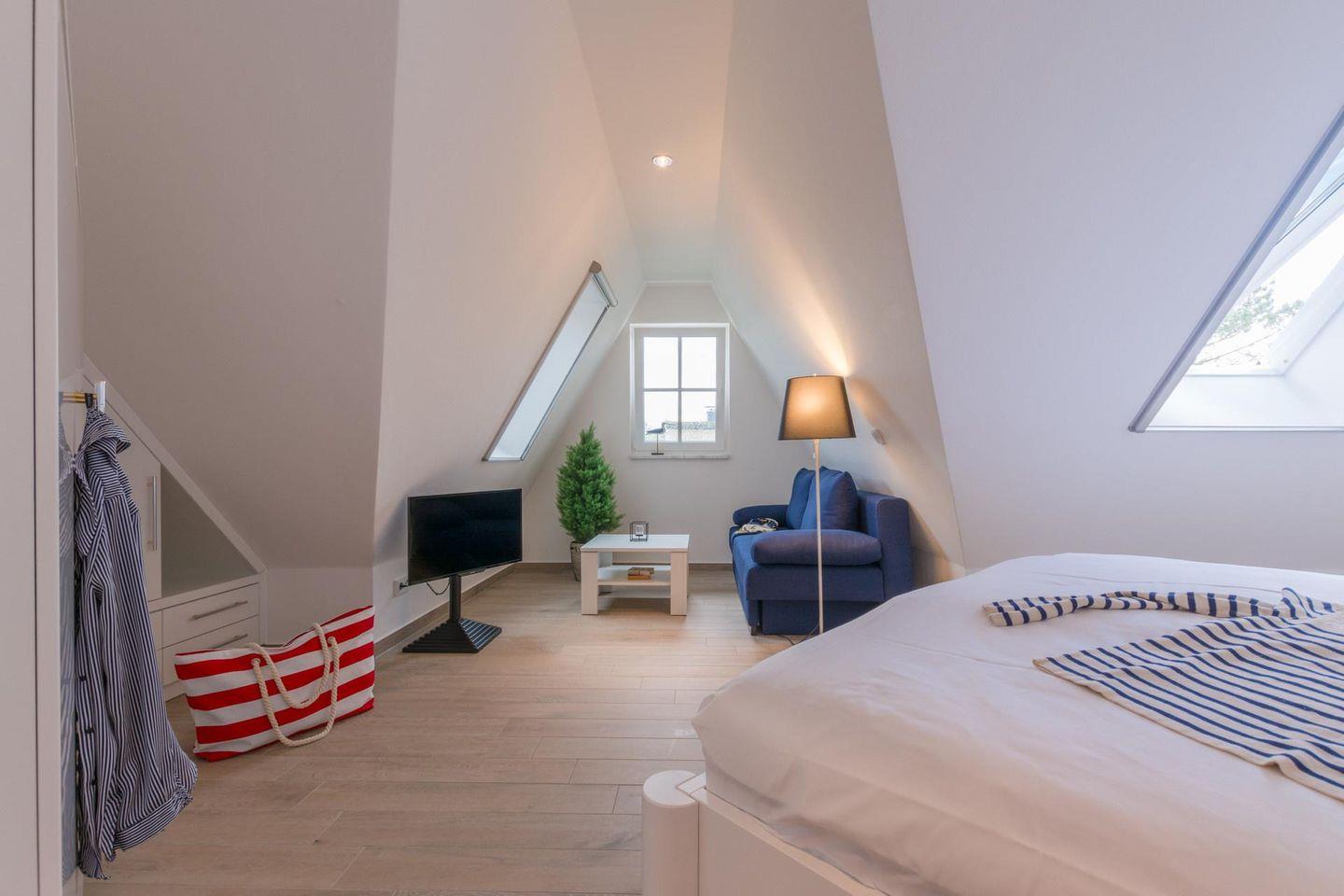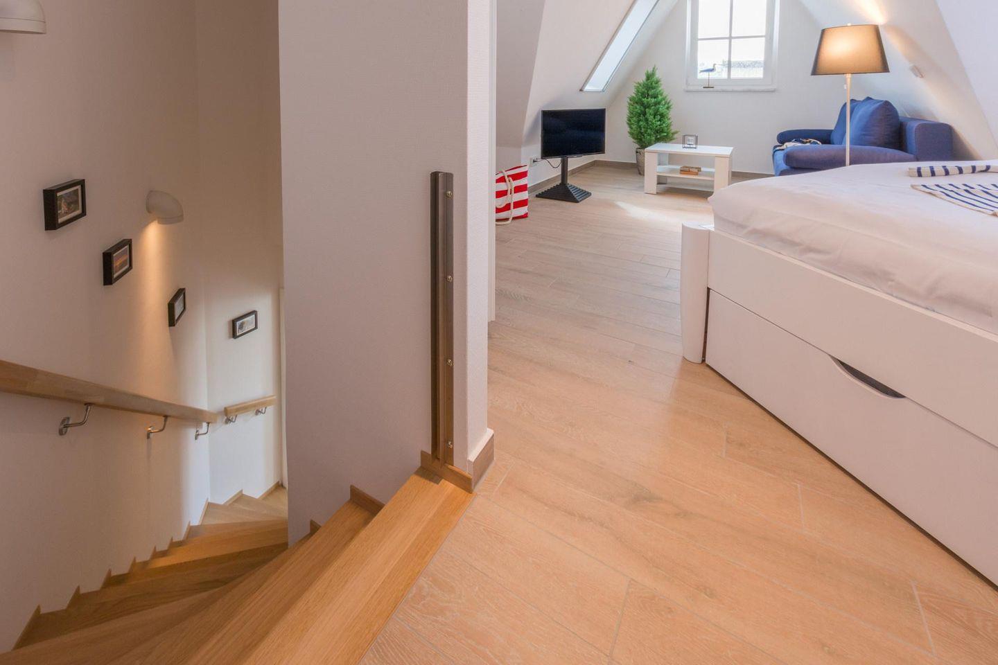 Im Obergeschoss finden Sie das gemütliche Schlafzimmer mit Doppelbett und TV und einer weiteren Schlafcouch als Aufbettung und Badezimmer mit Dusche/WC.