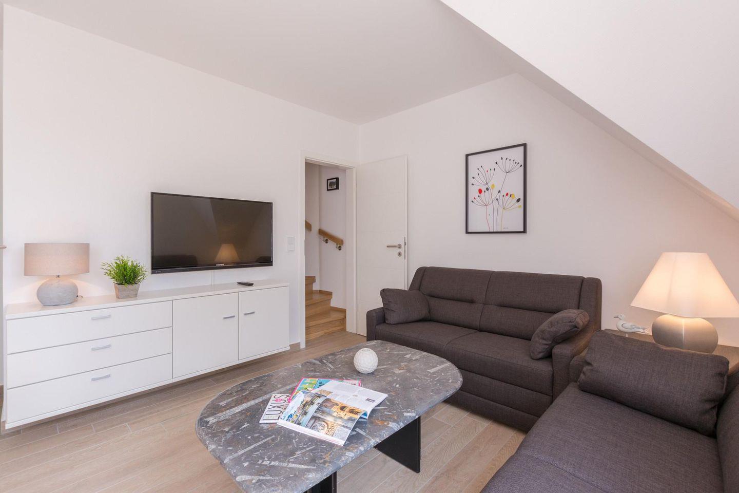 Im lichtdurchfluteten Wohnbereich finden Sie ein TV mit einer Schlafcouch als Aufbettung und ein Gäste - WC.