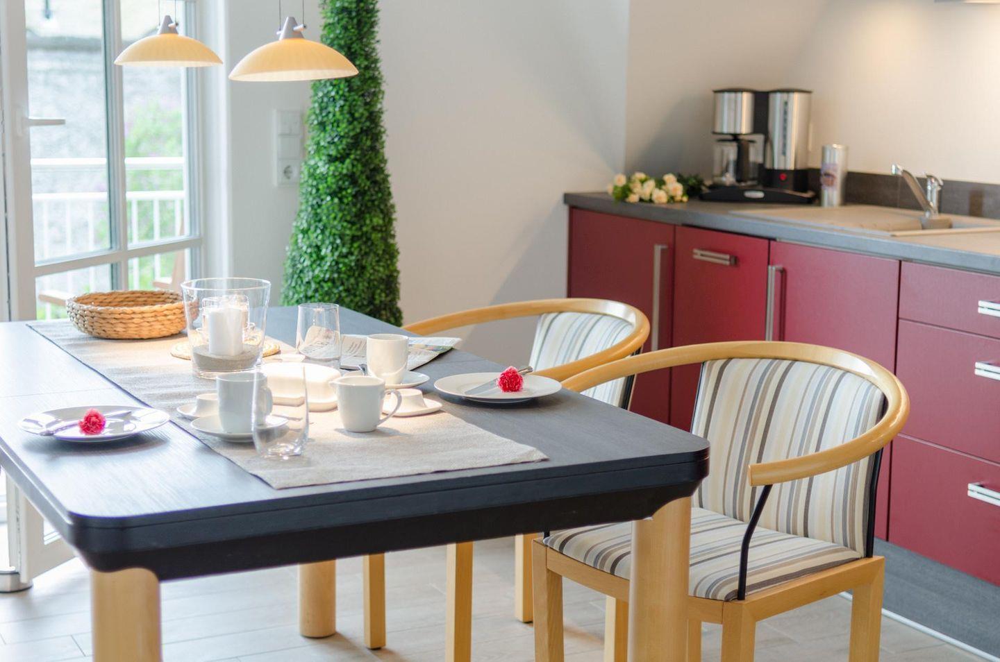 Die offene Küche, die nahtlos in das Wohn- und Esszimmer übergeht, ist vollständig ausgestattet mit modernen Elektrogeräten, darunter ein Ceran-Herd, Kühlschrank mit Gefrierfach, Geschirrspüler, Mikrowelle und eine Kaffeemaschine.