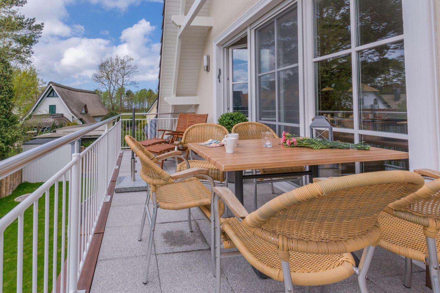 Einer der Höhepunkte dieser Ferienwohnung ist der traumhaft große Balkon, der mit Sonnenliegen, Balkonmöbeln und Sonnenschirm ausgestattet ist.