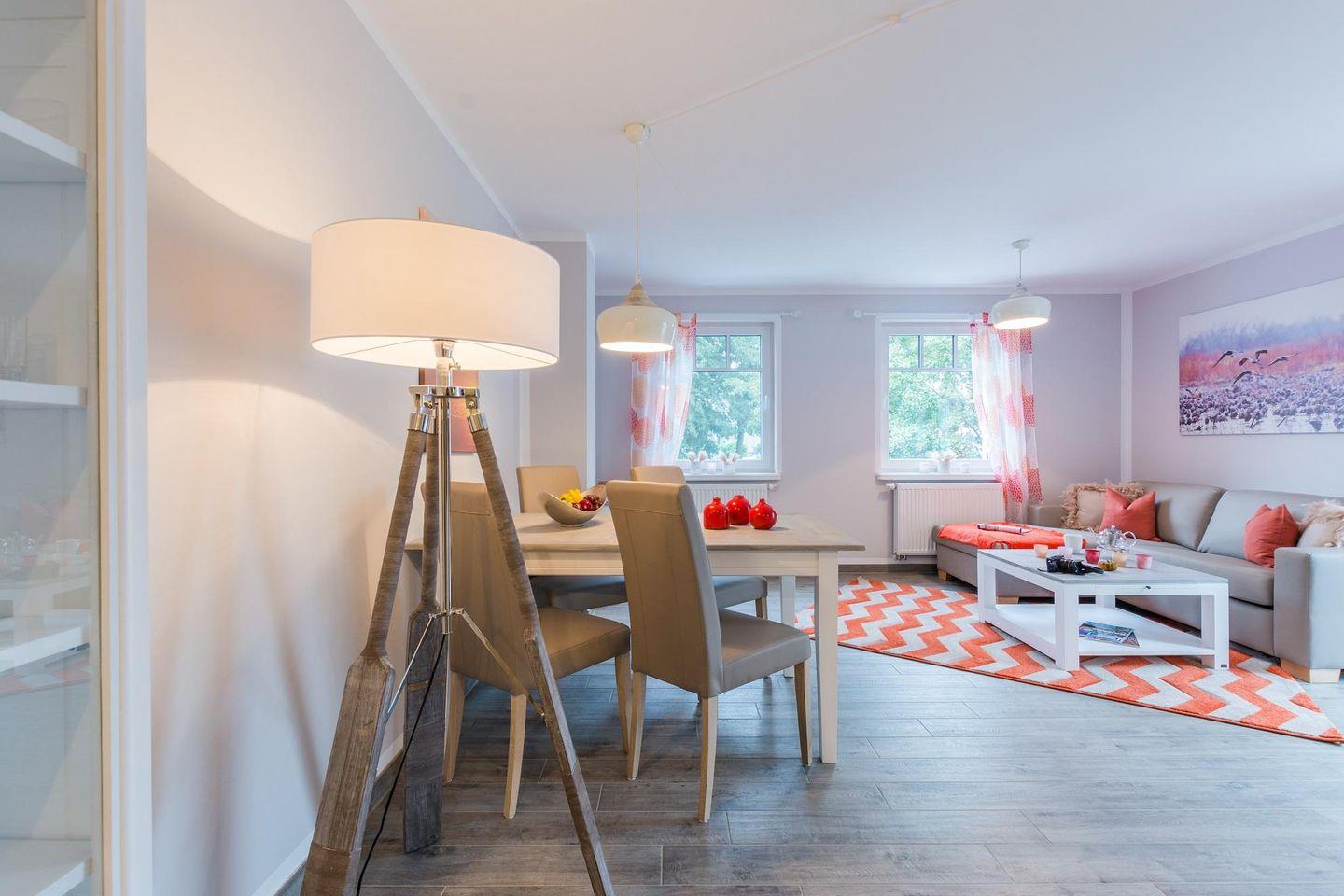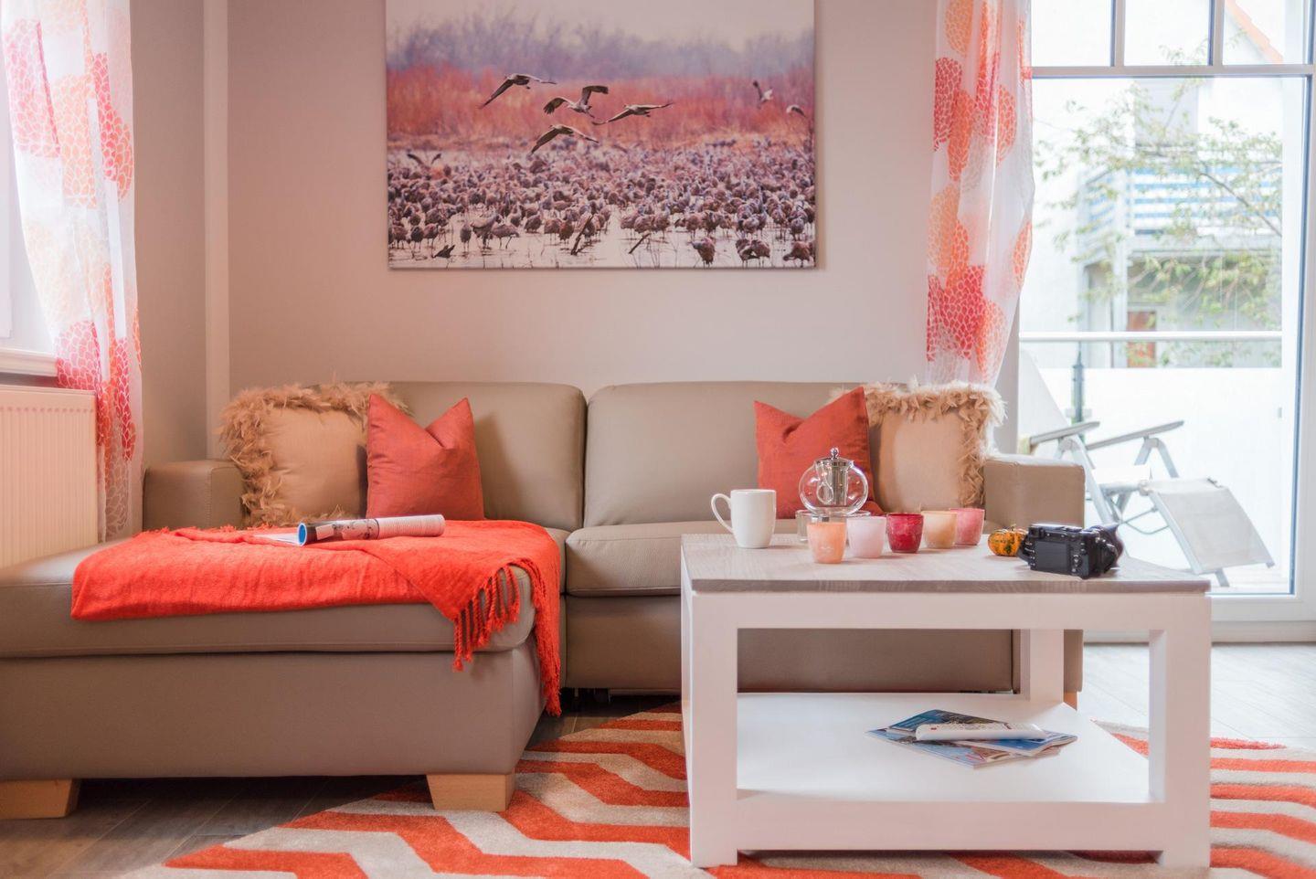 Schöne 53m² Ferienwohnung mit Fahrstuhl, hochwertig und maritim eingerichtet für 2-4 Personen in der 1.Etage eines Mehrfamilienhauses, der Fahrstuhl hält in der 1 Etage und dann sind es nur noch 4 Stufen bis zur Wohnung, zentrale Lage im Ortskern, die Entfernung zum Bodden ist 600m, zum Strand sind es 500 m, Wohnzimmer mit kompletter Küchenzeile, hochwertige Schlafcouch , TV, WLAN-Internet inkl. Balkon, Insektenschutz, Schlafzimmer mit Ehebett und TV, Bad mit bodengleicher Dusche
