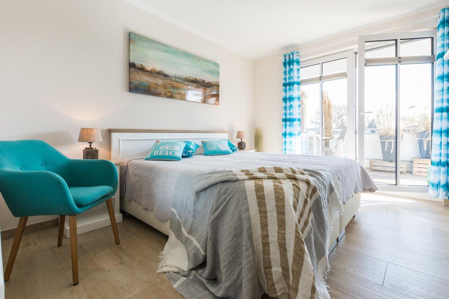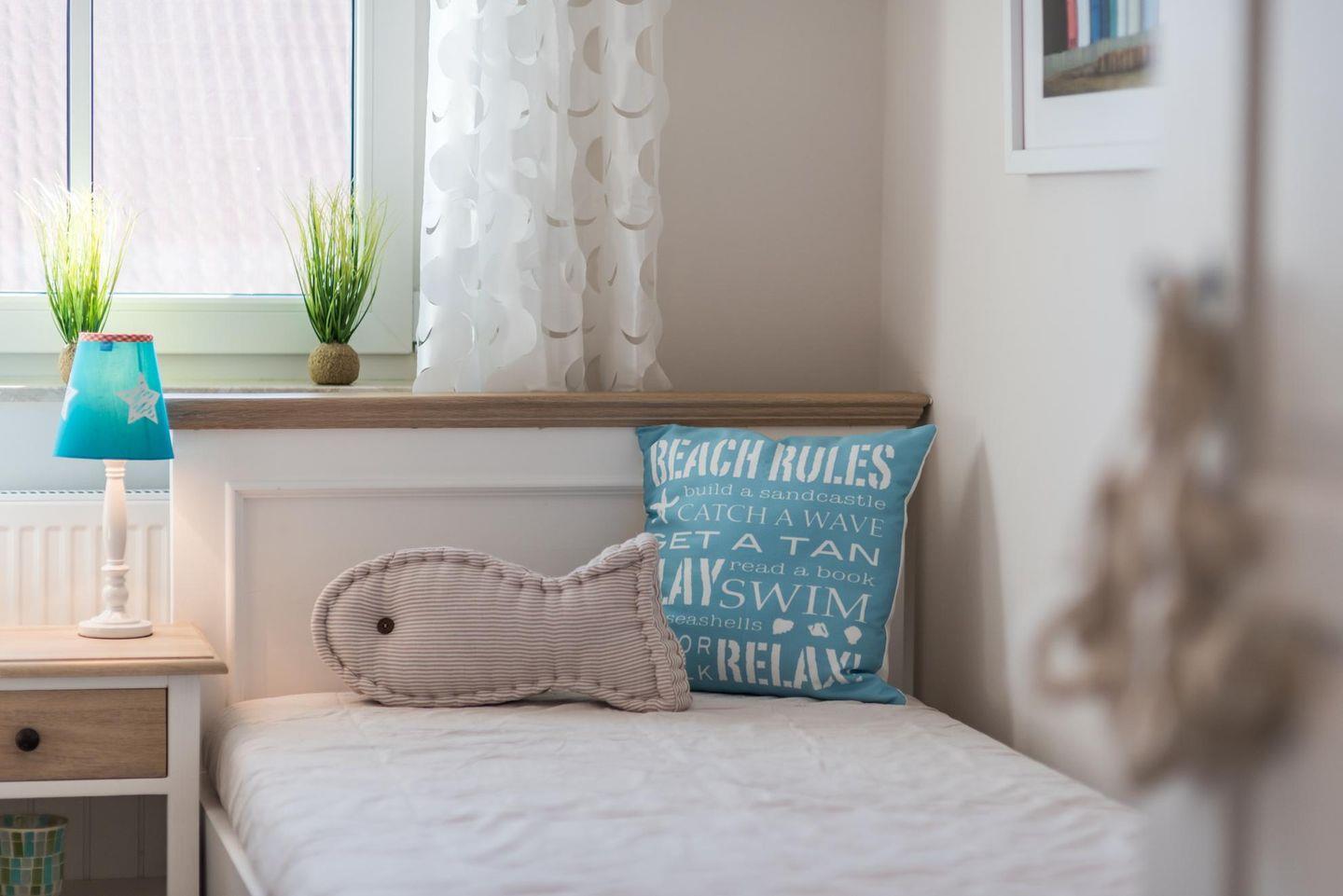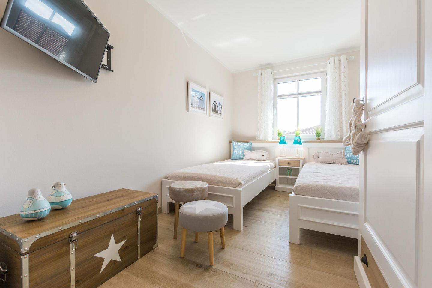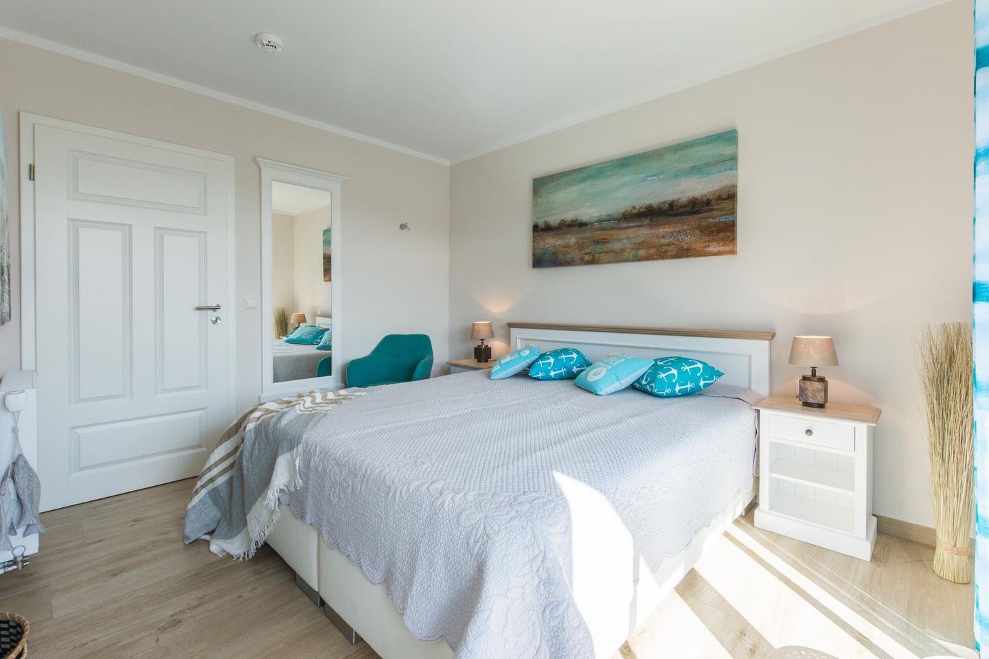 Die Unterkunft verfügt über 2 Schlafzimmer. Ein Schlafzimmer mit Marken-Boxspringbett und im kleineren Schlafzimmer zwei Einzelbetten mit Marken-Schlafmatratzen.