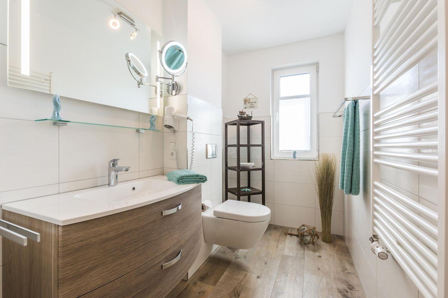 Im Badezimmer erwartet Sie eine ebenerdige Dusche mit Regeneffekt, WC, ein Hotelfön und ein beleuchteter Kosmetikspiegel.