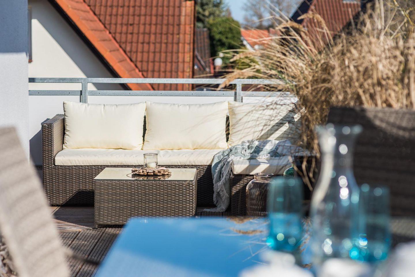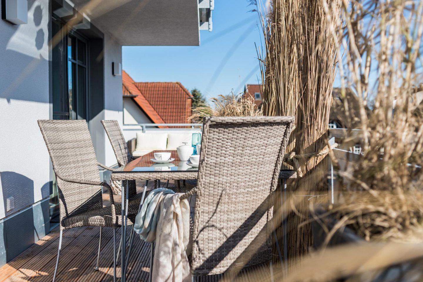 Die liebevoll, mit hochwertigem maritimen Mobiliar, eingerichtete Ferienwohnung hat einen riesigen Eckbalkon (25 m² Ost-Süd-West-Lage) wo Sie ganztägig Sonne haben.