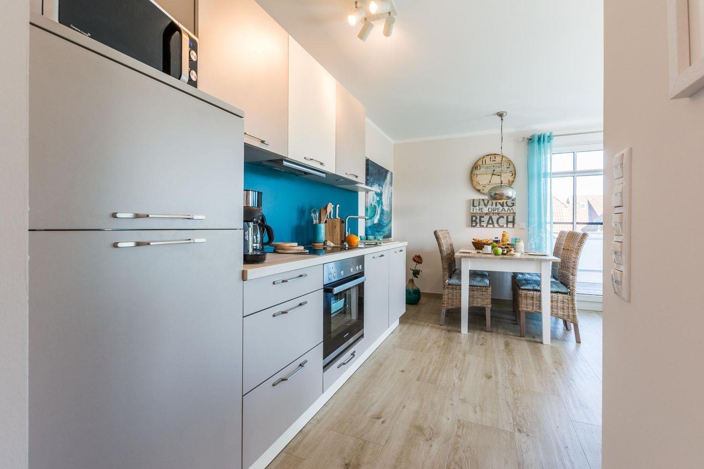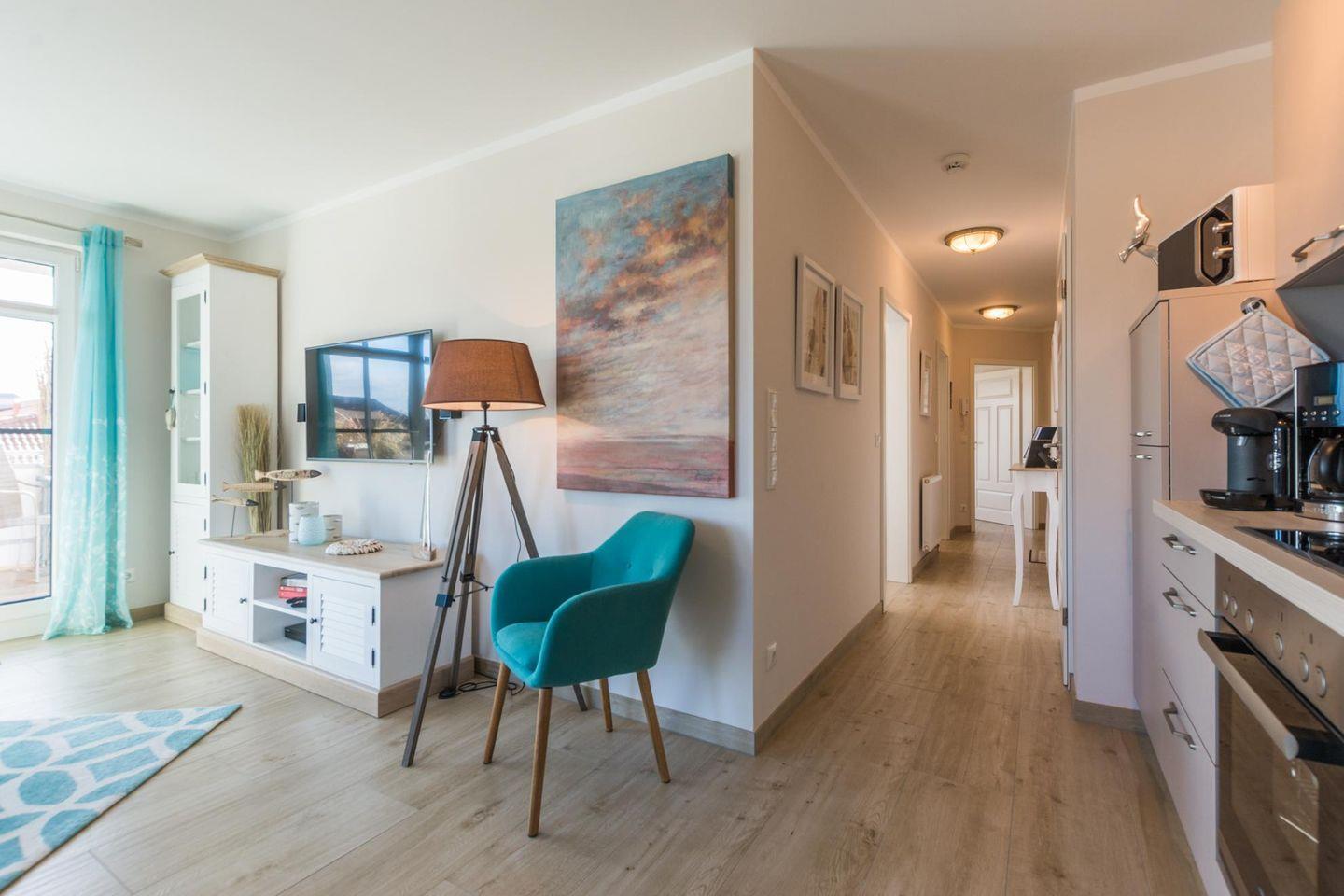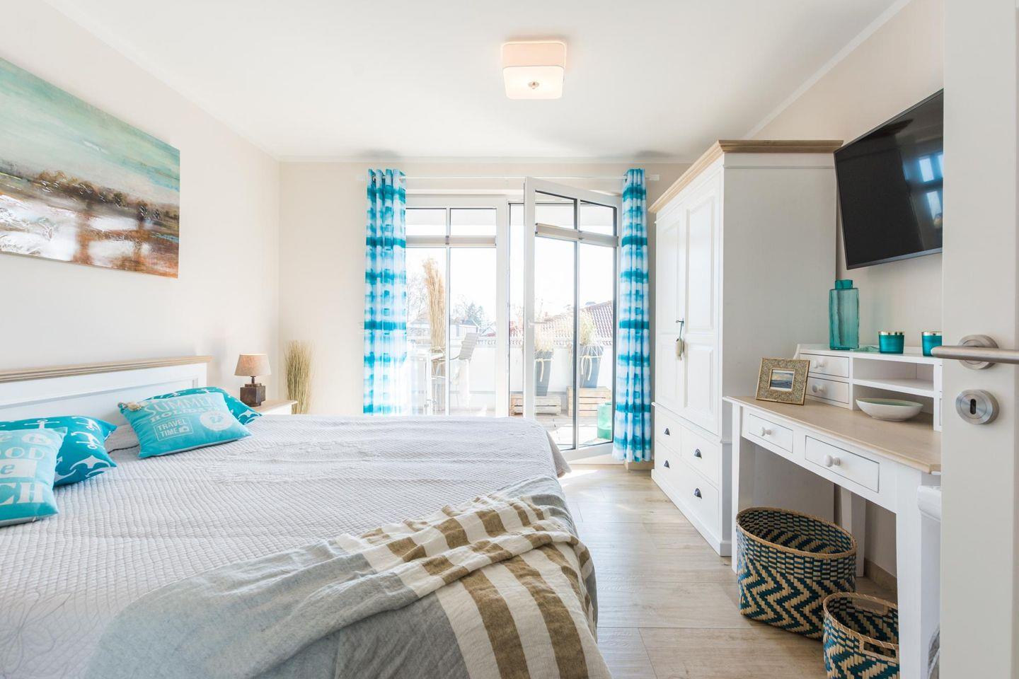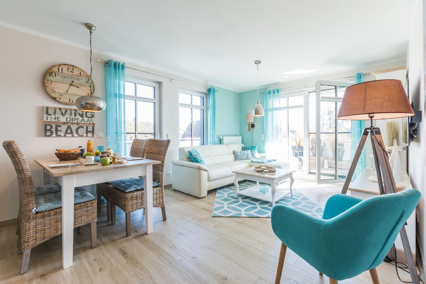 "von Witte" – Eine liebevoll, mit hochwertigem maritimem Mobiliar, eingerichtete Ferienwohnung mit einem riesigen, ganztägig sonnigen Eckbalkon (25 qm, Ost-Süd-West-Lage). Die großen Fenstertüren zum Balkon, in fast jedem Raum, bringen nicht nur an sonnigen Tagen viel Licht und gute Laune in dieses Küstendomizil.