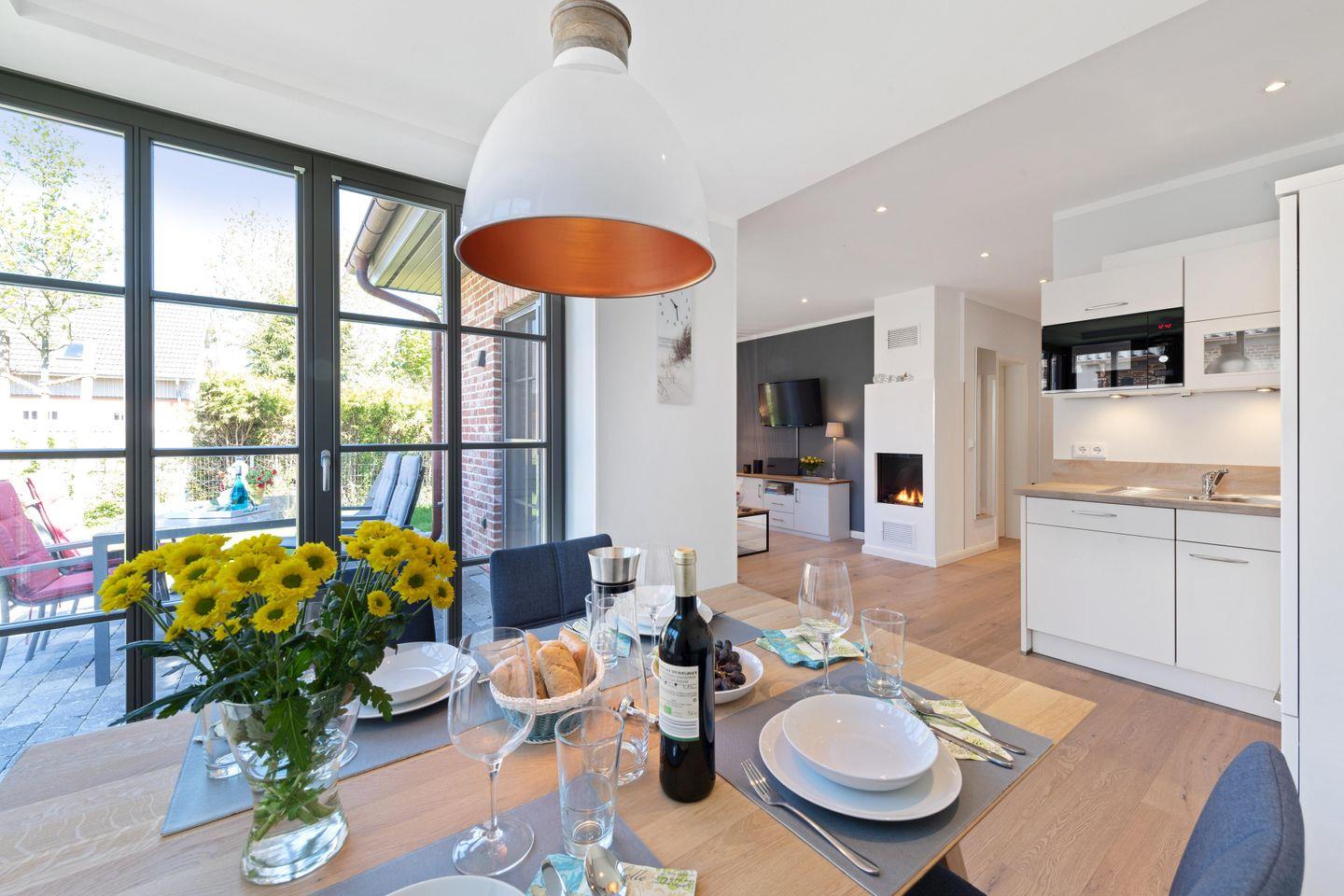 Die offene Küche, die nahtlos in das helle Wohnzimmer übergeht, ist mit allen Annehmlichkeiten ausgestattet. Hier finden Sie einen Induktionsherd, eine Spülmaschine und einen Kühlschrank mit Gefrierfach. Genießen Sie Ihre Mahlzeiten an einem einladenden Esstisch oder auf der schönen Terrasse, die mit Gartenmöbeln und Sonnenschirm ausgestattet ist.
