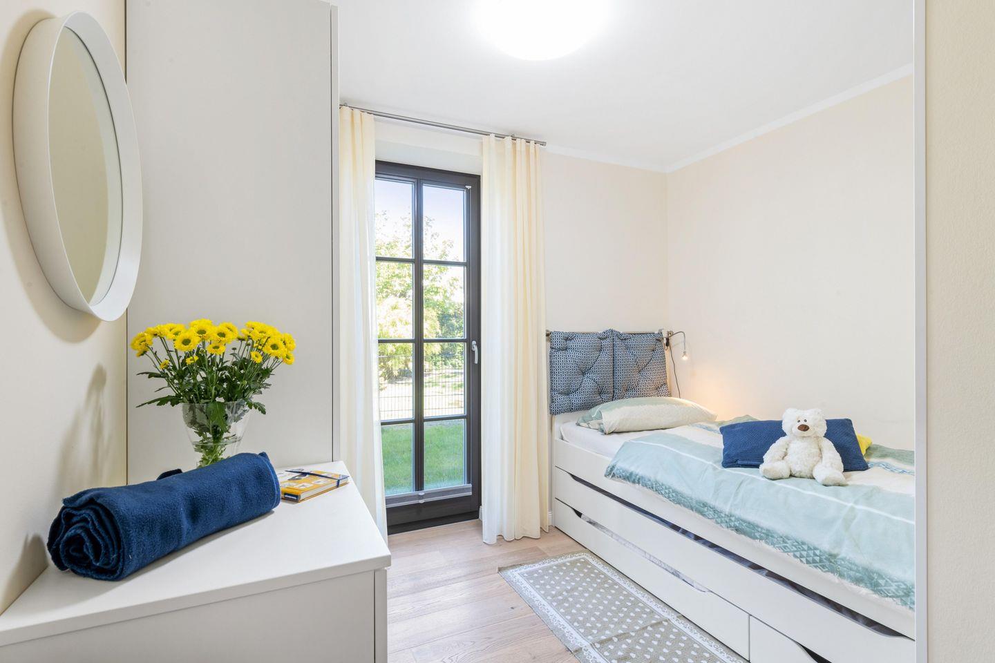 Ein Schlafzimmer ist mit einem Doppelbett (Boxspringbett, mit durchgehender Matratze 1,80 m x 2,00 m) und einem Kleiderschrank ausgestattet. Das andere Schlafzimmer mit einem Einzelbett und Auszug für die 4. Person.