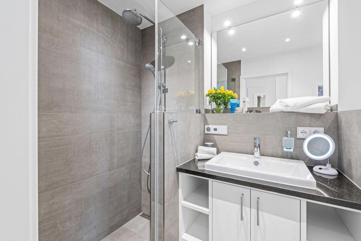 Das Badezimmer ist mit einer bodengleichen Dusche und WC ausgestattet.