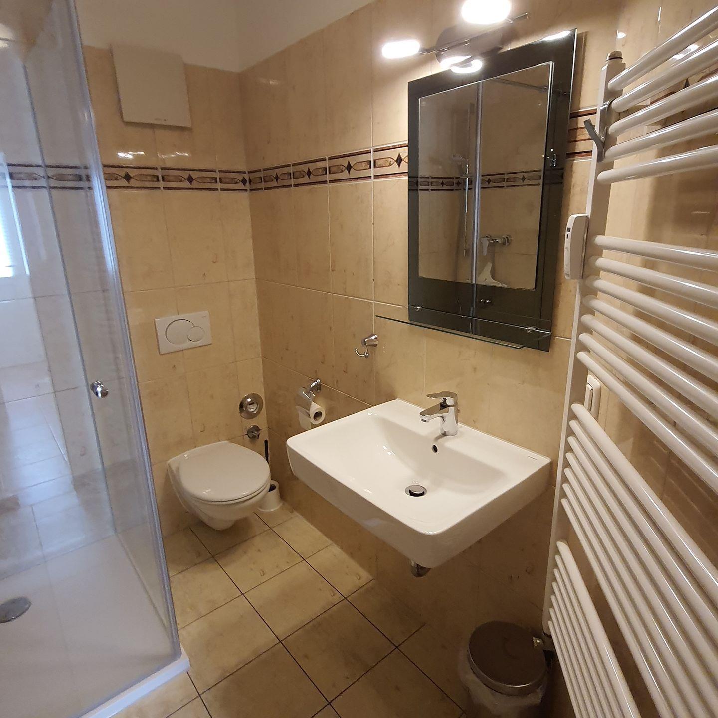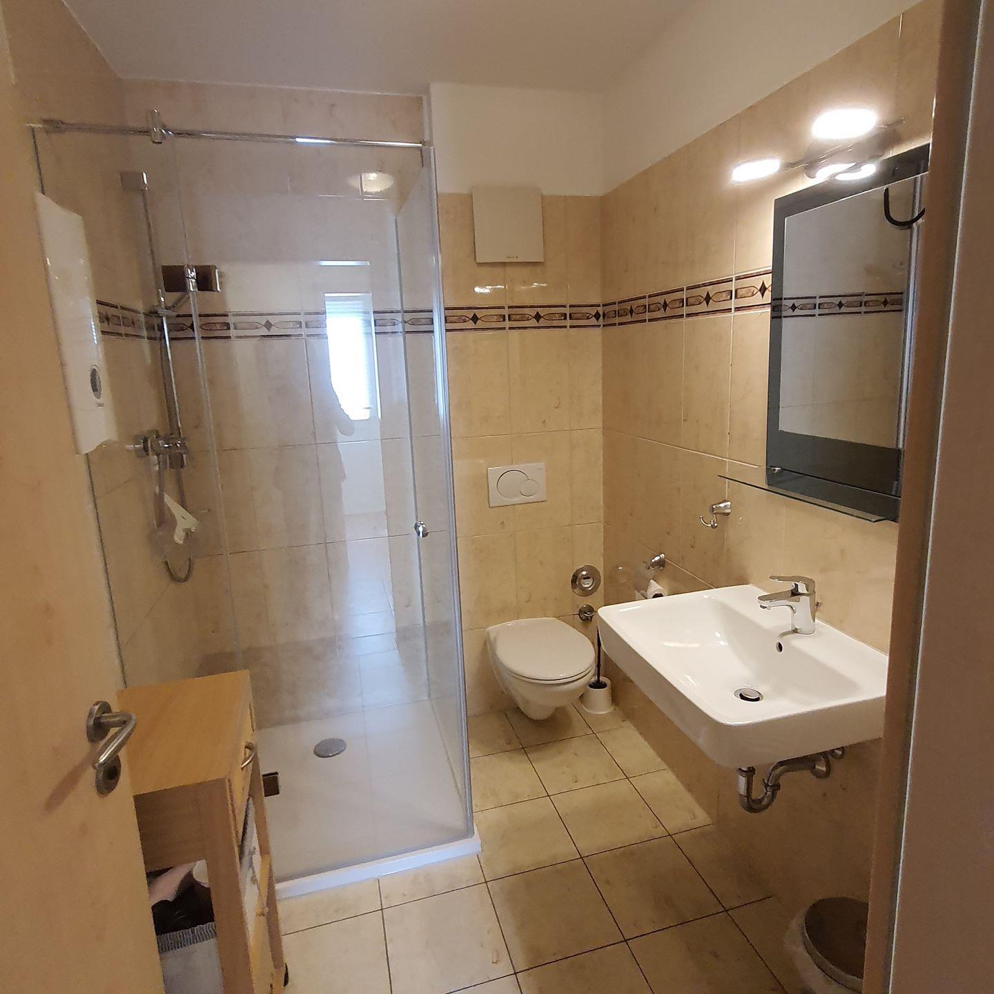 Das Badezimmer ist mit Dusche und WC ausgestattet.