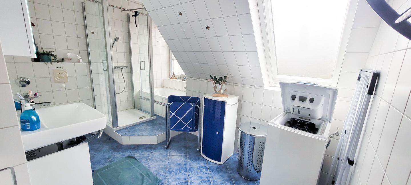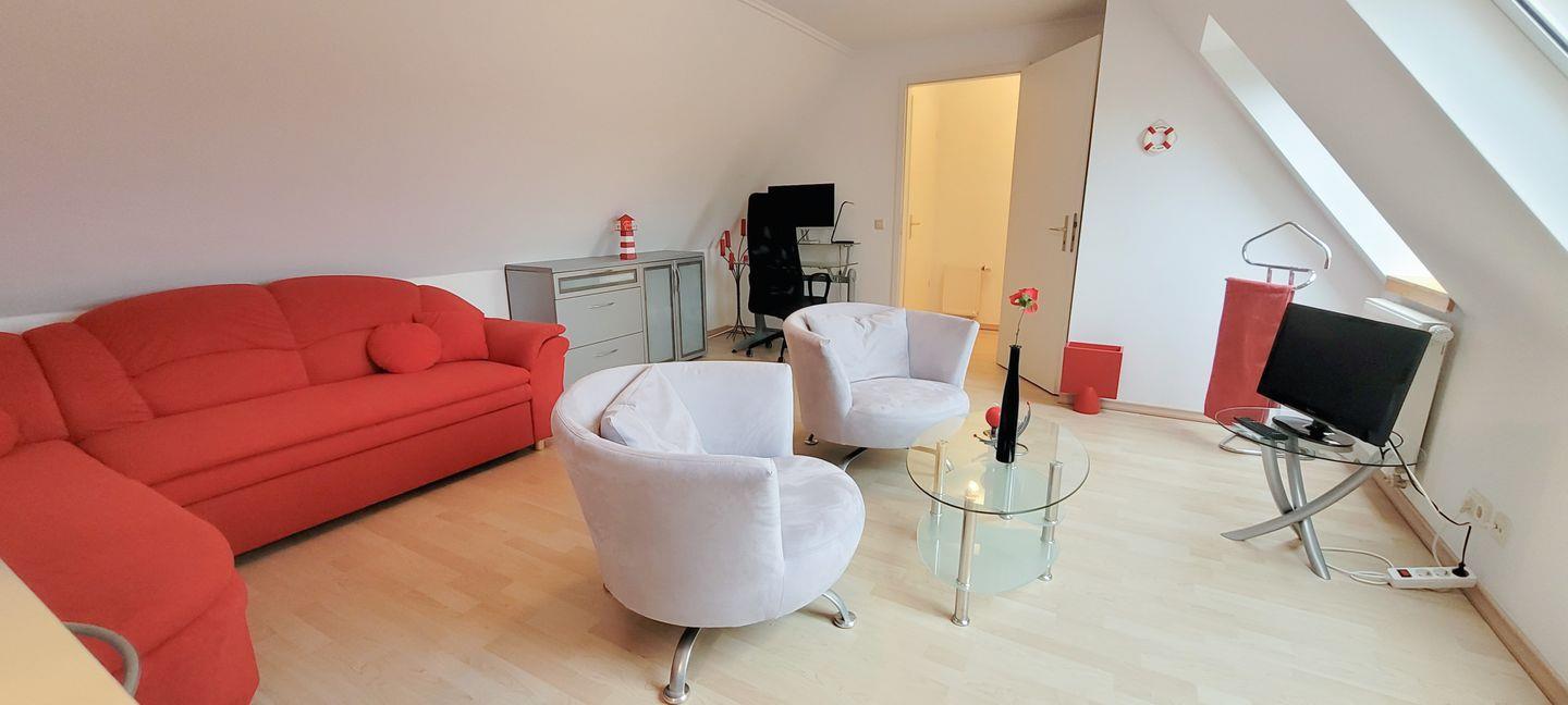 Wohnzimmer mit Küchenzeile, Home Office Arbeitsplatz, Bad mit Badewanne u. Dusche/WC, Waschmaschine, 1 Schlafzimmer mit Doppelbett und TV, 1 Schlafzimmer im DG mit Schlafcouch.