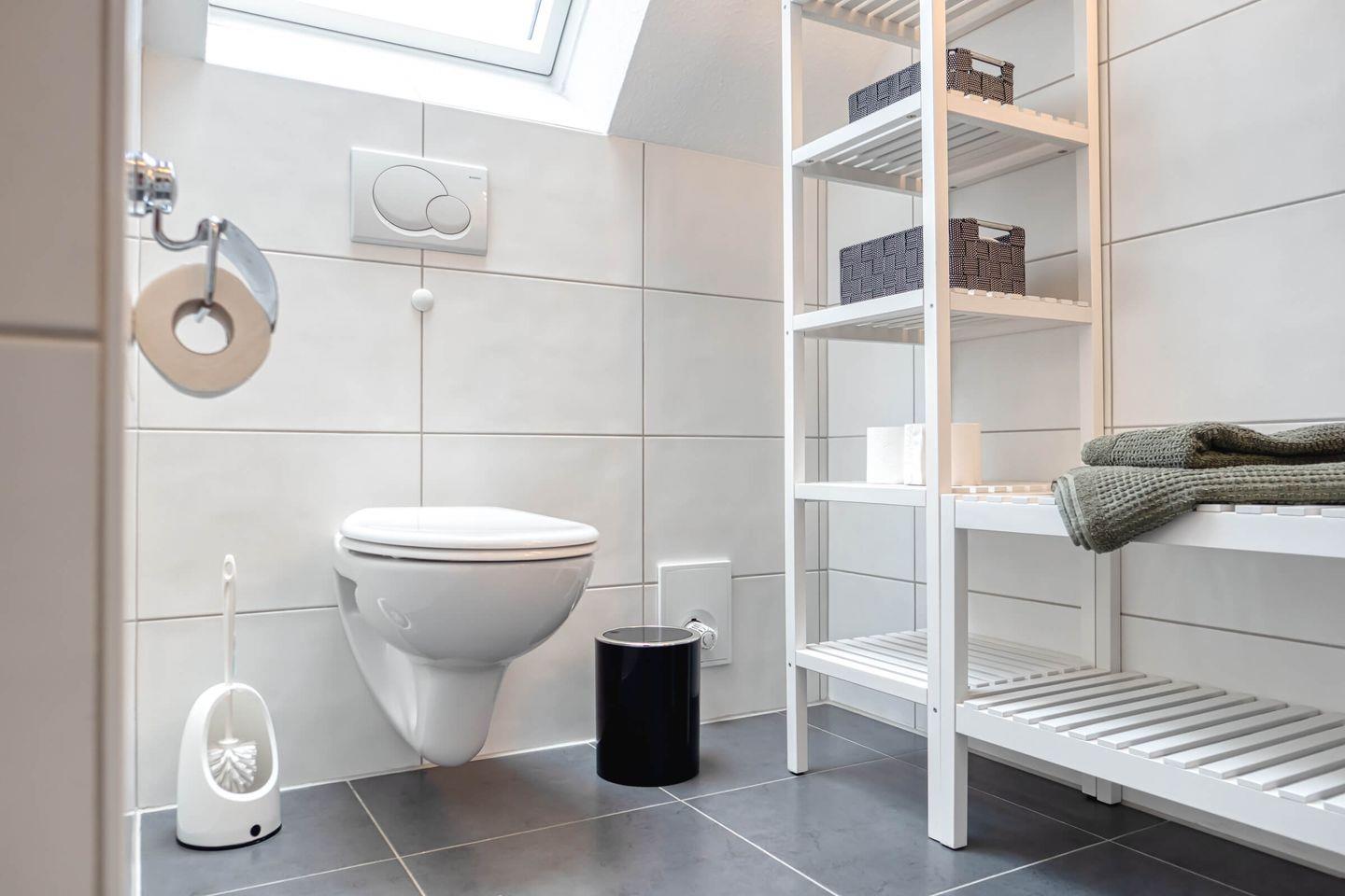Das Badezimmer ist mit Dusche und WC ausgestattet.
