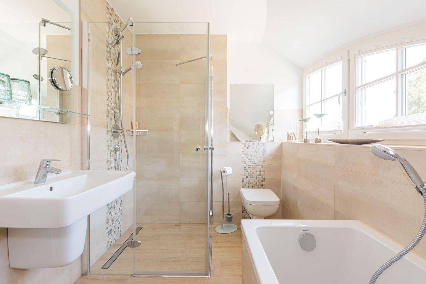 Erholen sie sich in der modernen, 2019 fertiggestellten Doppelhaushälfte. Dazu lädt ein lichtdurchfluteter, gemütlicher Wohn-Essbereich mit großem TV und Bluetooth - fähiger CD/ Radioanlage, sowie eine offene, komplett ausgestattete Küche mit Herd, Ofen, Mikrowelle und Kühl-Gefrierkombination mit Kühlschrank auf Augenhöhe ein. Für besten Komfort sorgen auch die beiden Bäder mit bodengleicher Dusche, eines davon mit Badewanne und die 3 Schlafzimmer mit TV für insgesamt fünf Personen (zwei Doppelbetten, ein Einzelbetten). Bei Bedarf sorgt die Fußbodenheizung auf beiden Etagen für behagliche Wärme.
