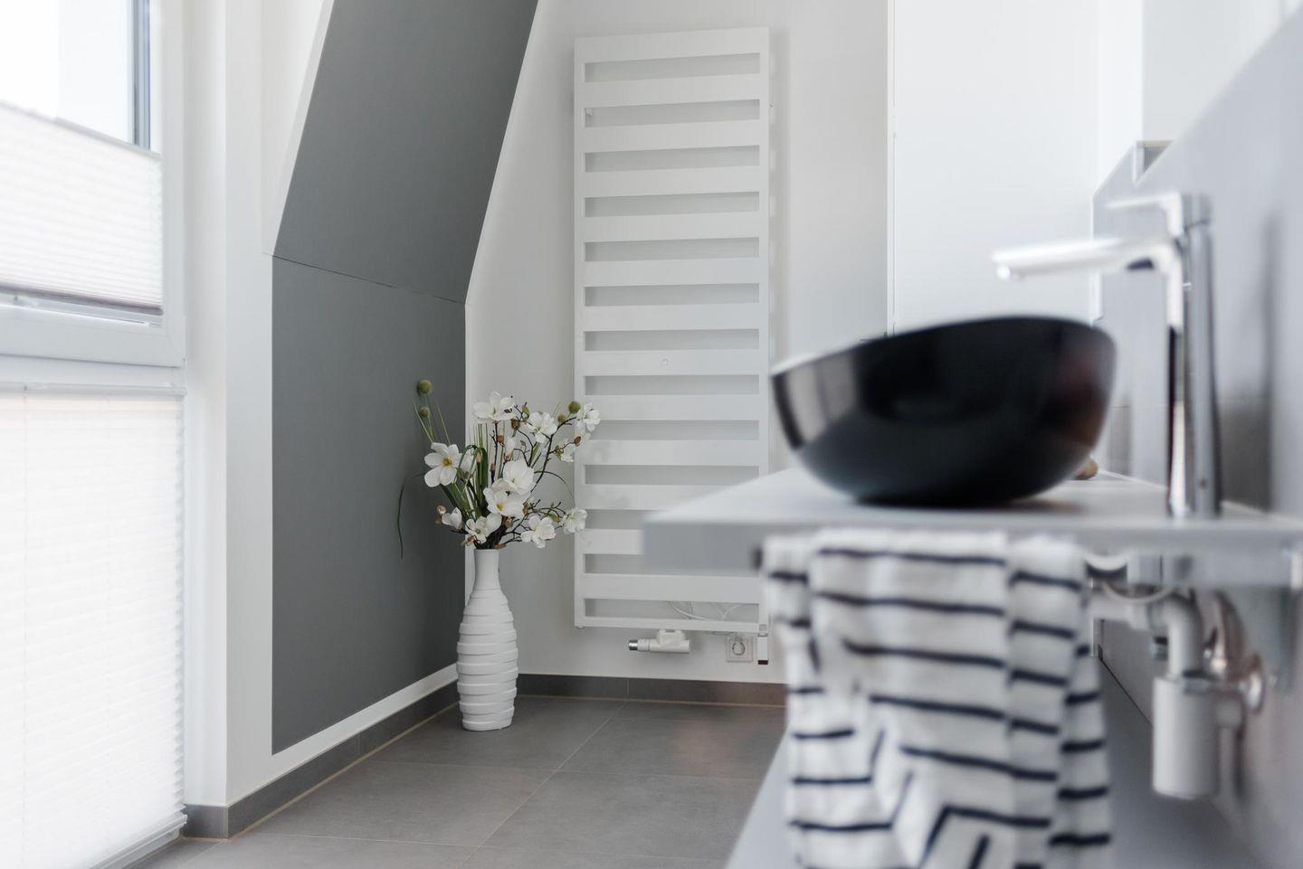 Das helle Bad mit Fenstern ist mit einer bodengleichen Dusche versehen.