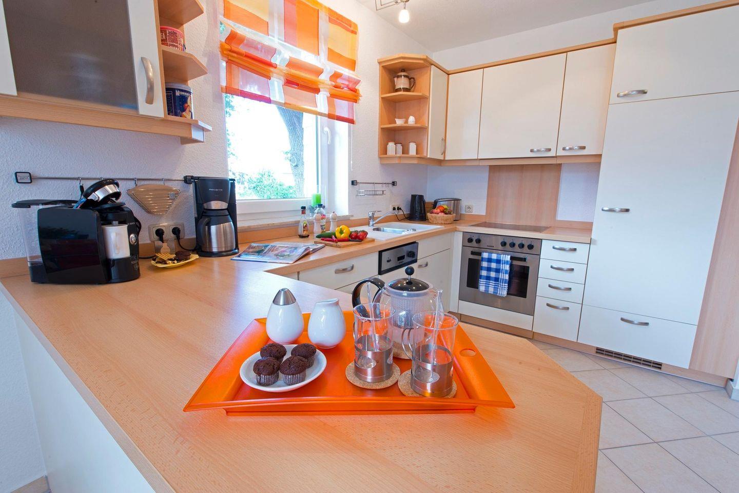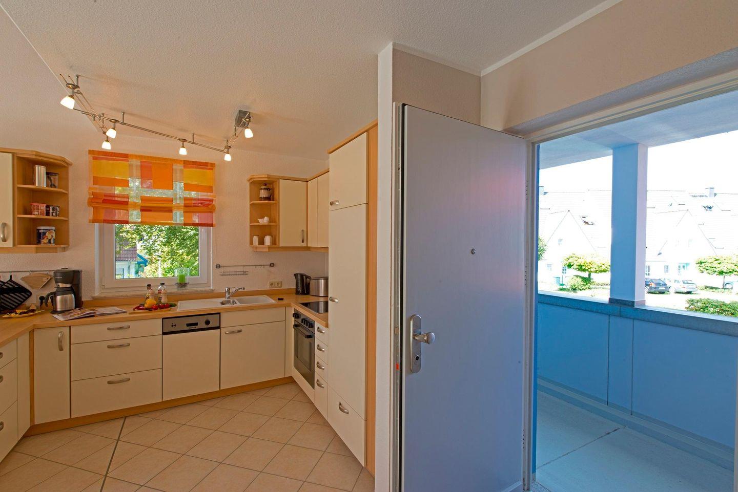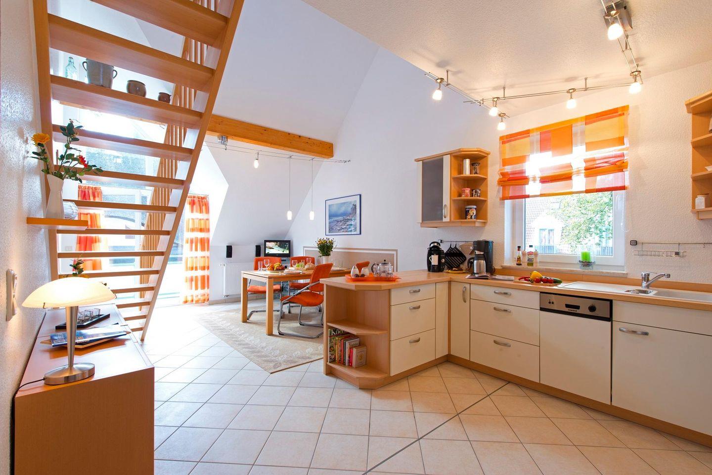Moderne komfortable Maisonettenwohnung in einem Appartementhaus, ca.68 m² im 1.Stock, ca.600 m zum Strand, 1 PKW-Stellplatz Nr.5, Balkon, zentrale Lage, komplette Küchenzeile mit Esstisch und TV, Schlafzimmer mit Doppelbett und TV, Dusche/WC, offenes Wohnzimmer mit Schlafcouch und TV im Obergeschoss, Kindersicherung an der Treppe