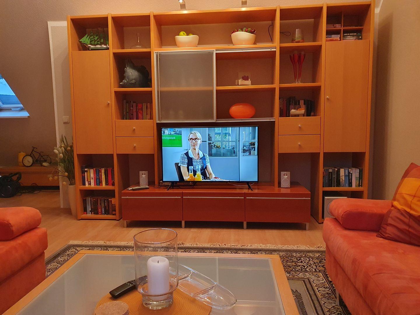 komplette Küchenzeile mit Esstisch und TV, Schlafzimmer mit Doppelbett und TV, Dusche/WC
