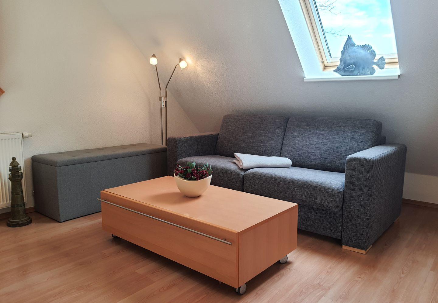 offenes Wohnzimmer mit Schlafcouch und TV im Obergeschoss
