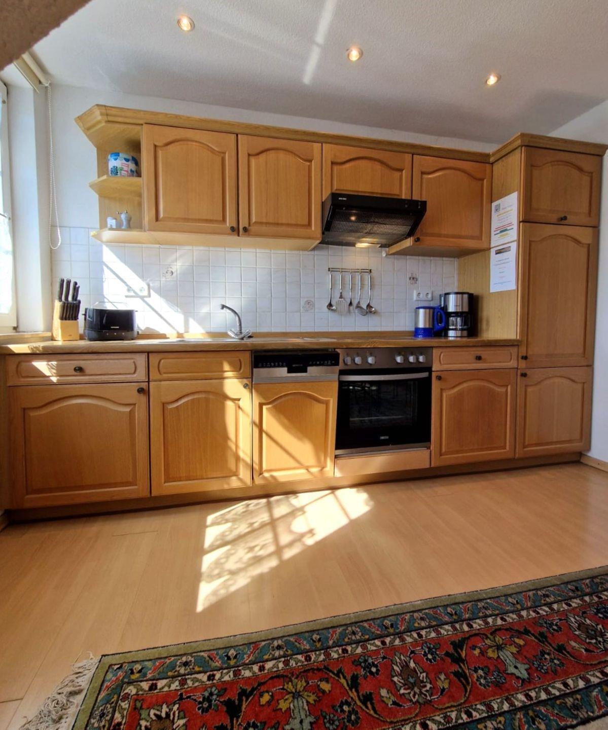 Die Küche ist voll ausgestattet mit Elektrogeräten wie einem Herd, Backofen, Kühlschrank, Geschirrspüler und einer Kaffeemaschine.