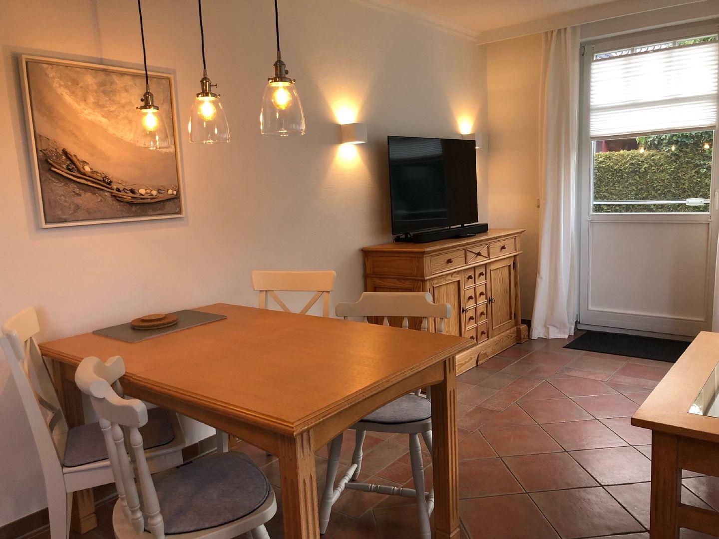 Ihre mit Liebe zum Detail ausgestatte Ferienwohnung empfängt Sie mit einem lichtdurchfluteten großen Wohnbereich mit voll eingerichteter Küche. Von hier haben Sie Zugang zur teils überdachten Terrasse mit eigenem Gartenanteil.