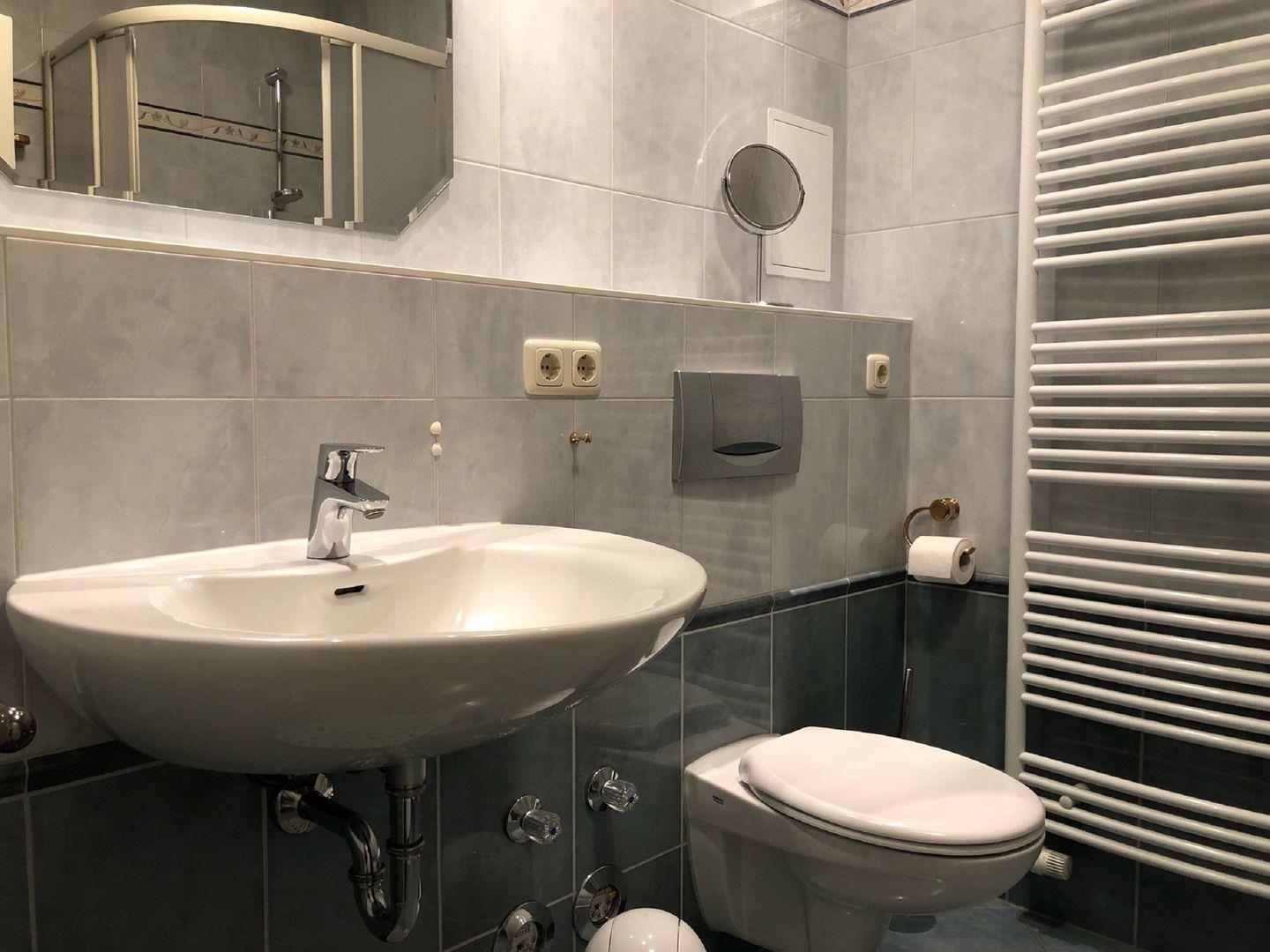 Das Bad ist mit einer großen Runddusche und Handtuchheizkörper ausgestattet.