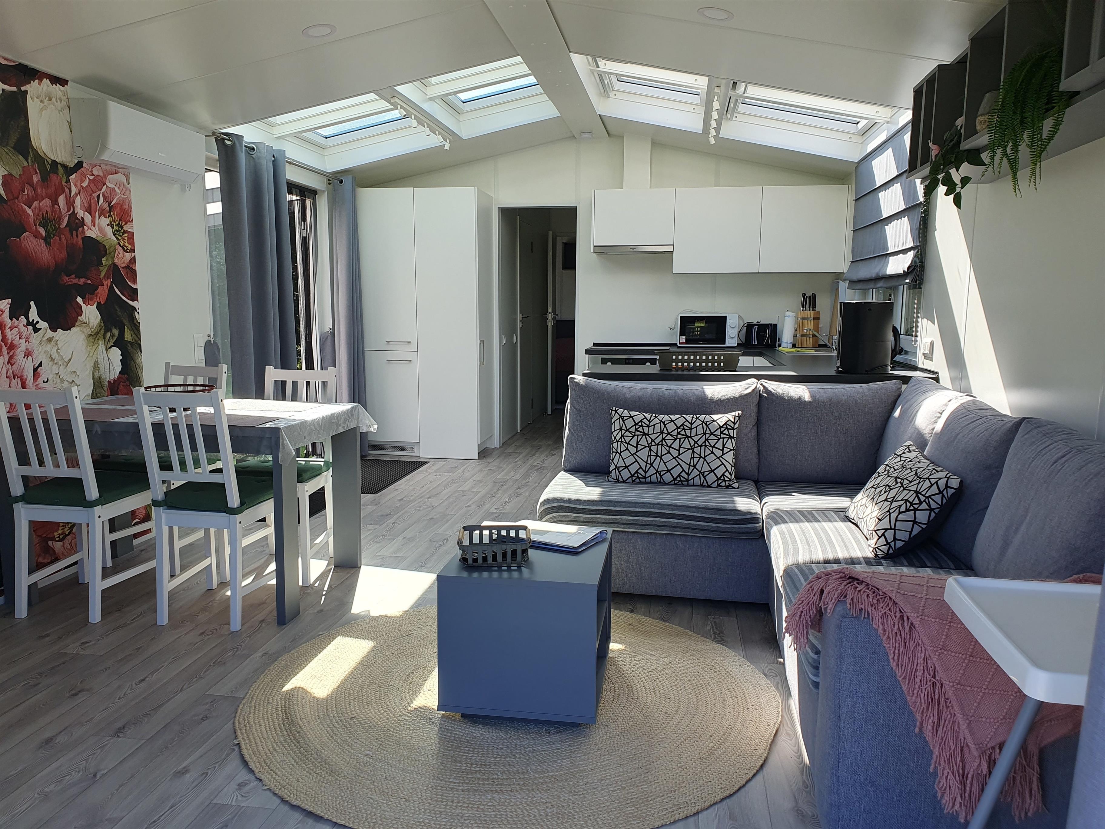 Wohnraum mit Sitzecke und TV, offener Küche und Esstisch