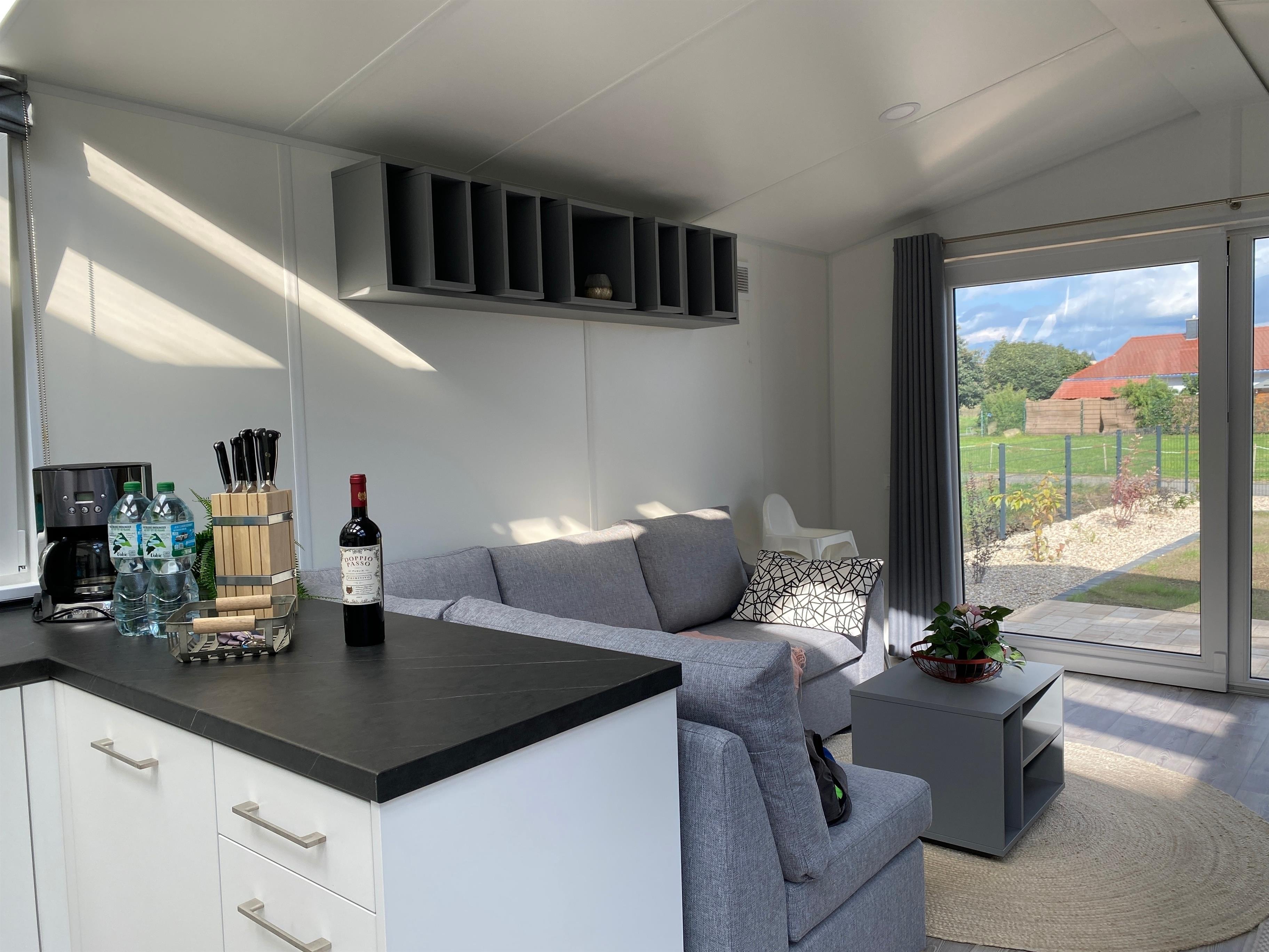 - offene Küche mit 4-Zonen-Induktionsfeld, Kaffeemaschine, Wasserkocher, Mikrowelle mit Grillfunktion, Kühl-Gefrierkombi, Geschirrspüler und Toaster