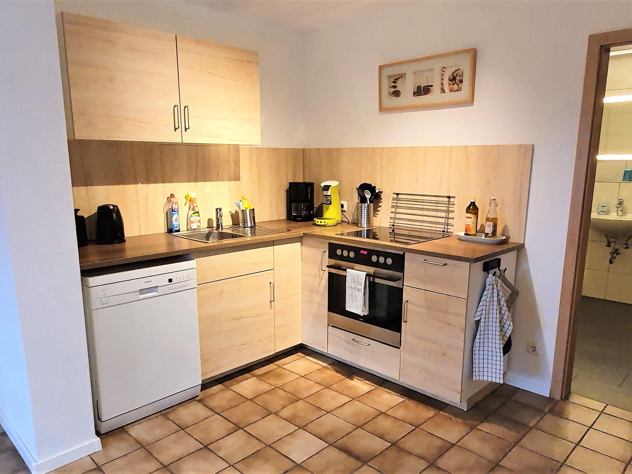 Voll ausgestattete und moderne Einbauküche mit Cerankochfeld und Backofen, Mikrowelle, Geschirrspüler und Kühl-/Gefrierkombination.