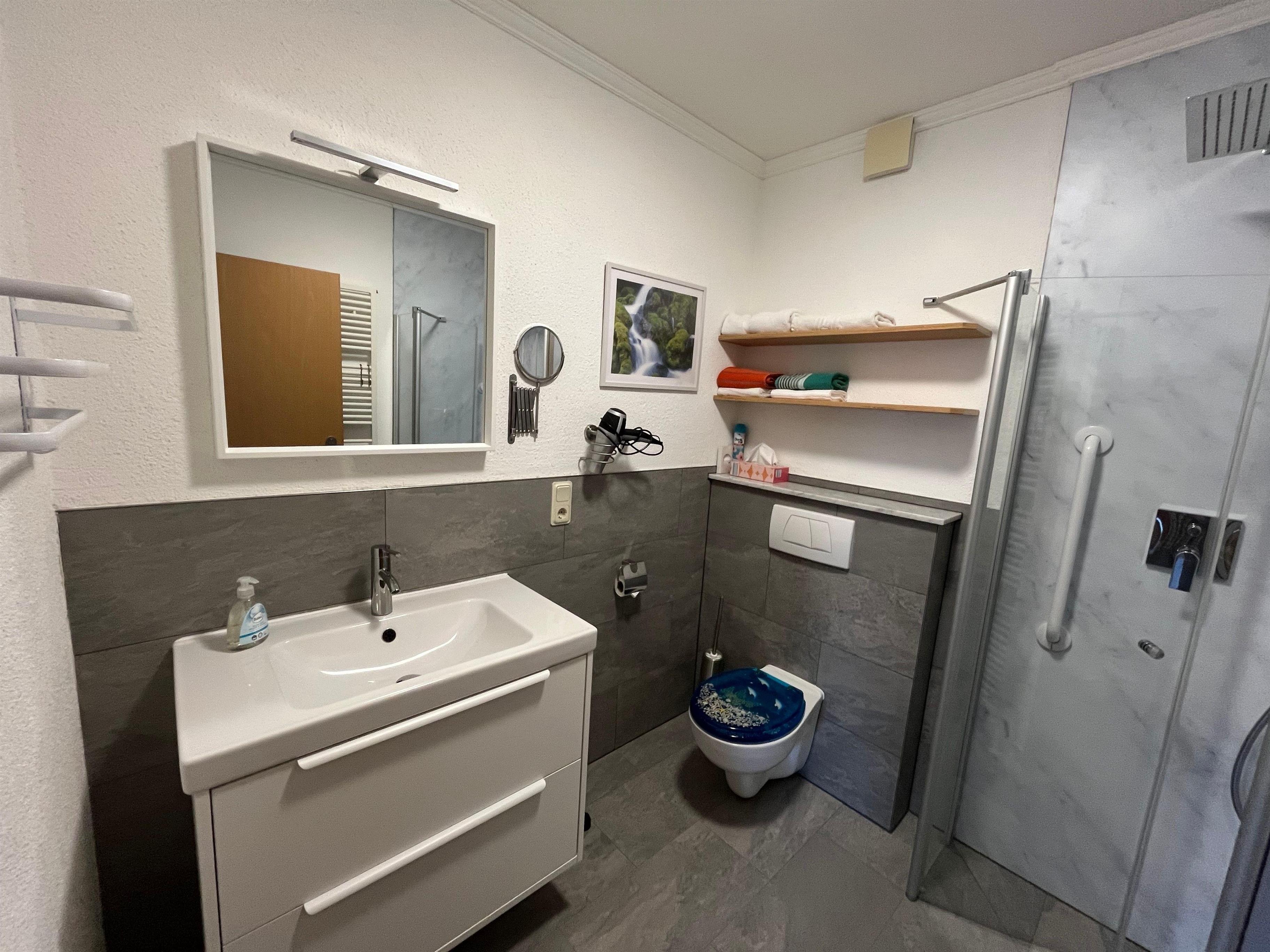 Nach betreten der Diele, kommen Sie in den offenen Wohn- Esszimmer und Küchenbereich. Gerade aus, finden Sie das geräumige Bad / WC. Ausreichende Ablagen für Ihre mitgebrachten Kosmetik und Badeartikel stehen für Sie bereit.