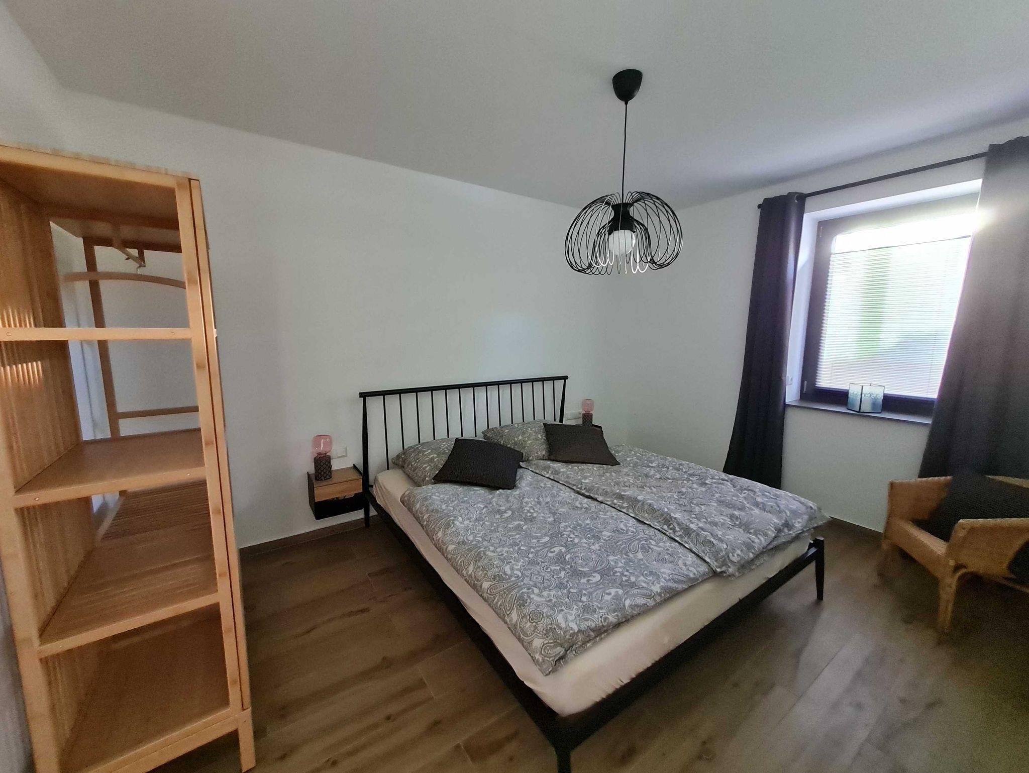 Das größzügige Ferienhaus verfügt in der unteren Etage über ein Wohn-/ Essbereich mit offener Küche, zwei Schlafzimmer mit Doppelbetten sowie ein großes Duschbad.