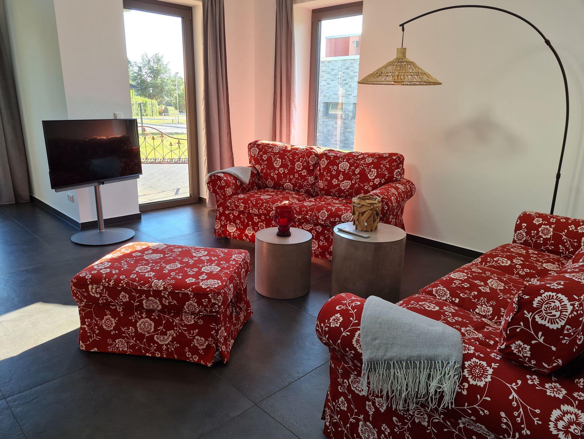 Im Außenbereich befindet sich eine Terrasse, die mit einer großen Lounge ausgestattet ist.