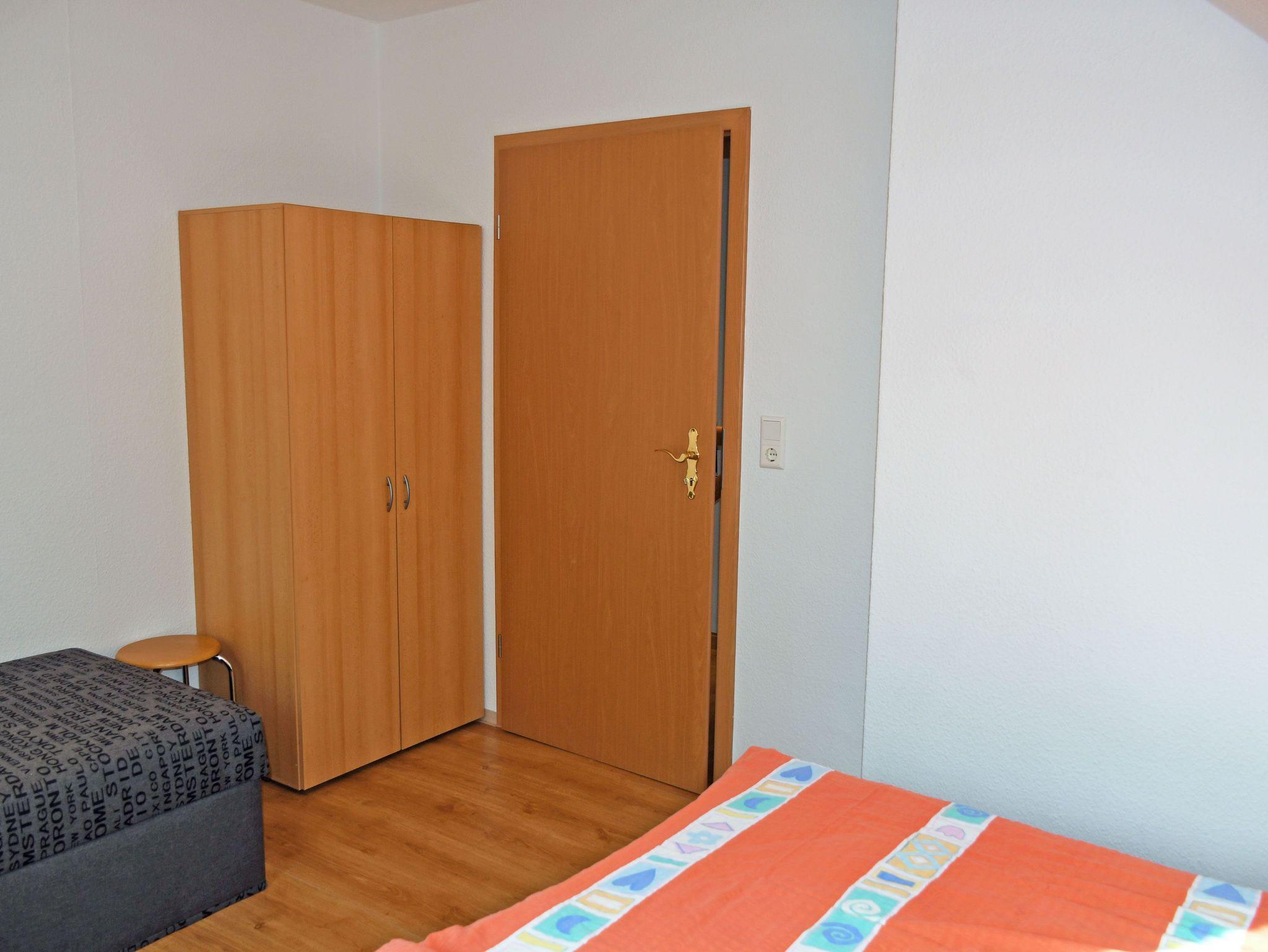 Über eine Holztreppe gelangt man in das Obergeschoss mit zwei getrennten Schlafzimmern. Diese sind jeweils mit bequemen Doppelbetten mit Nachttischen und Leselampen sowie Ablageschränken ausgestattet. In beiden Schlafzimmerr steht ein zusätzliches Einzelbett. Etagenbett.