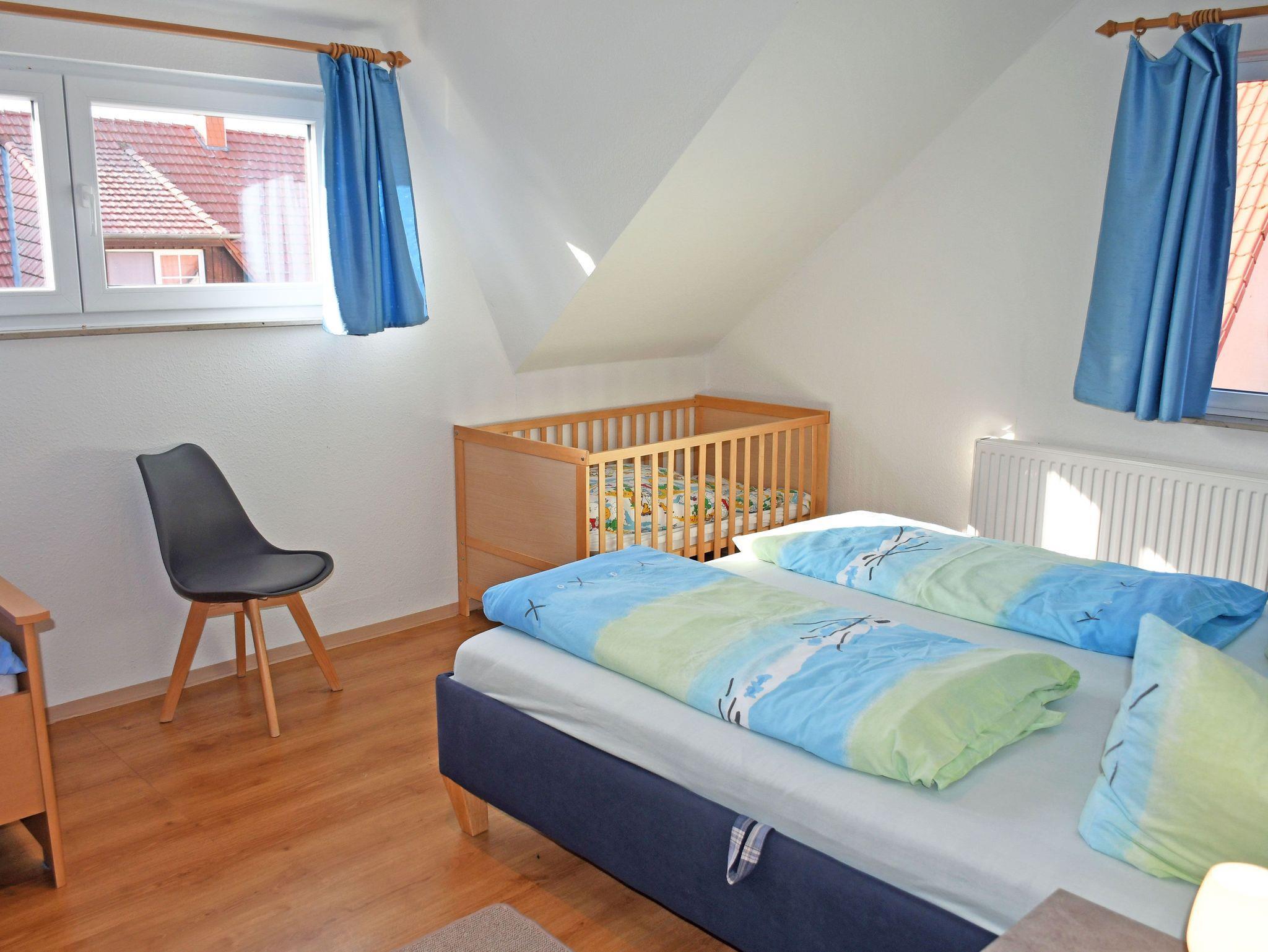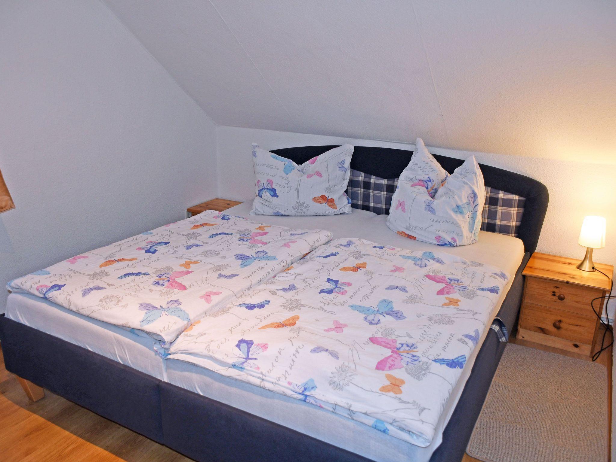 Über eine Holztreppe gelangt man in das Obergeschoss mit zwei getrennten Schlafzimmern. Diese sind jeweils mit bequemen Doppelbetten mit Nachttischen und Leselampen sowie Ablageschränken ausgestattet. Im 2. Schlafzimmer steht ein zusätzliches Etagenbett.