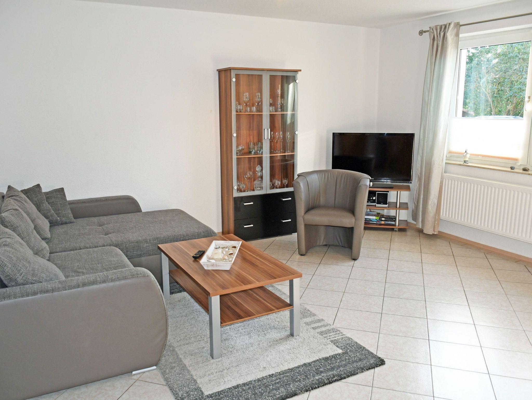 Im Erdgeschoss betritt man die Appartements über einen Flur mit Garderobe. Im großen Wohnraum befinden sich eine Couch mit Sessel und Tisch, Schrank, Flachbild-TV und eine Musikanlage.