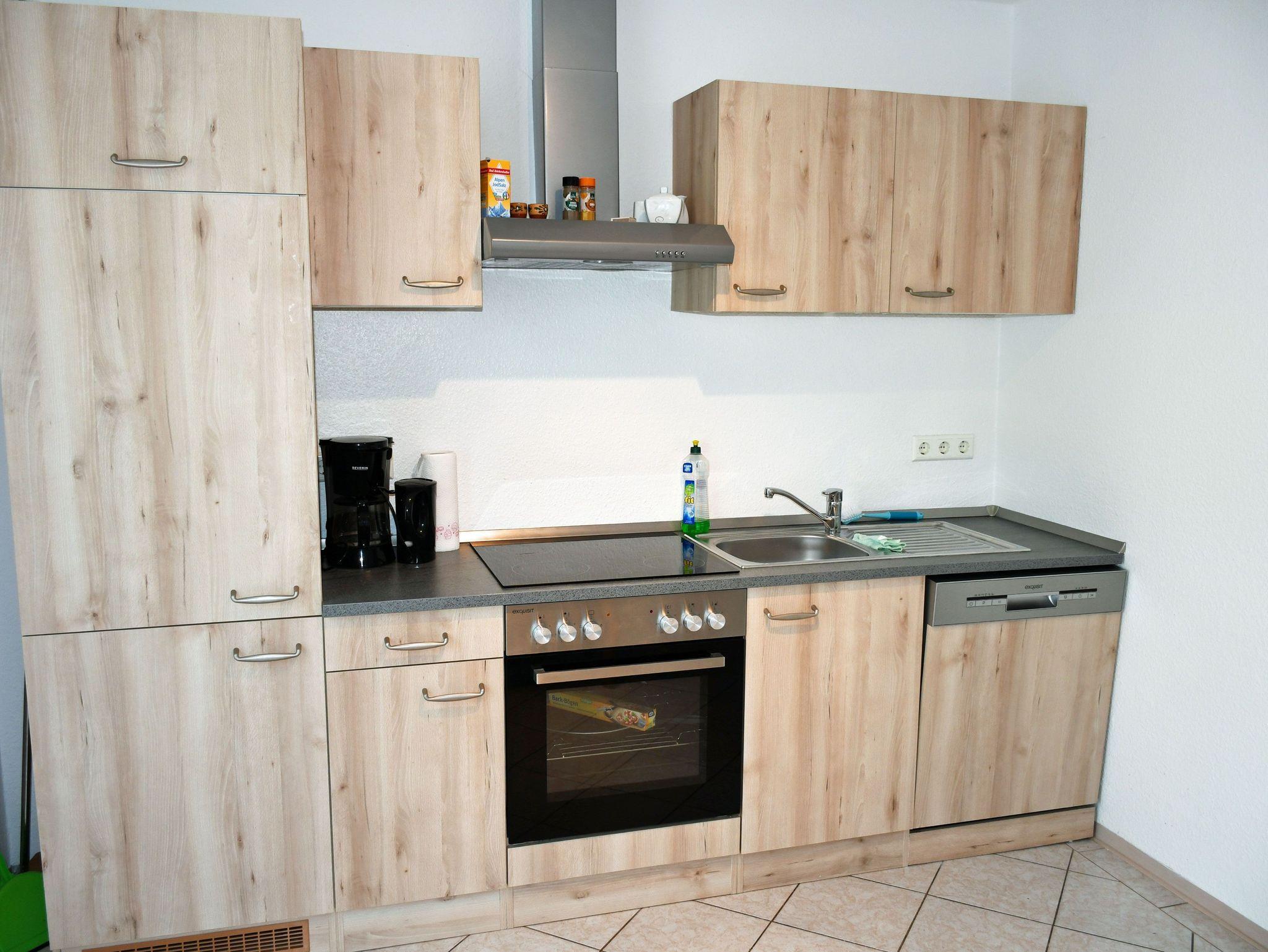 Der separate große Küchenbereich bietet einen Esstisch mit Stühlen und eine Küchenzeile. Diese ist mit einem Backofen, Herd mit Abzugshaube, Spülmaschine, Wasserkocher, Kaffeemaschine, Mikrowelle, Toaster, Wasserkocher und Kühlschrank komplett ausgestattet.