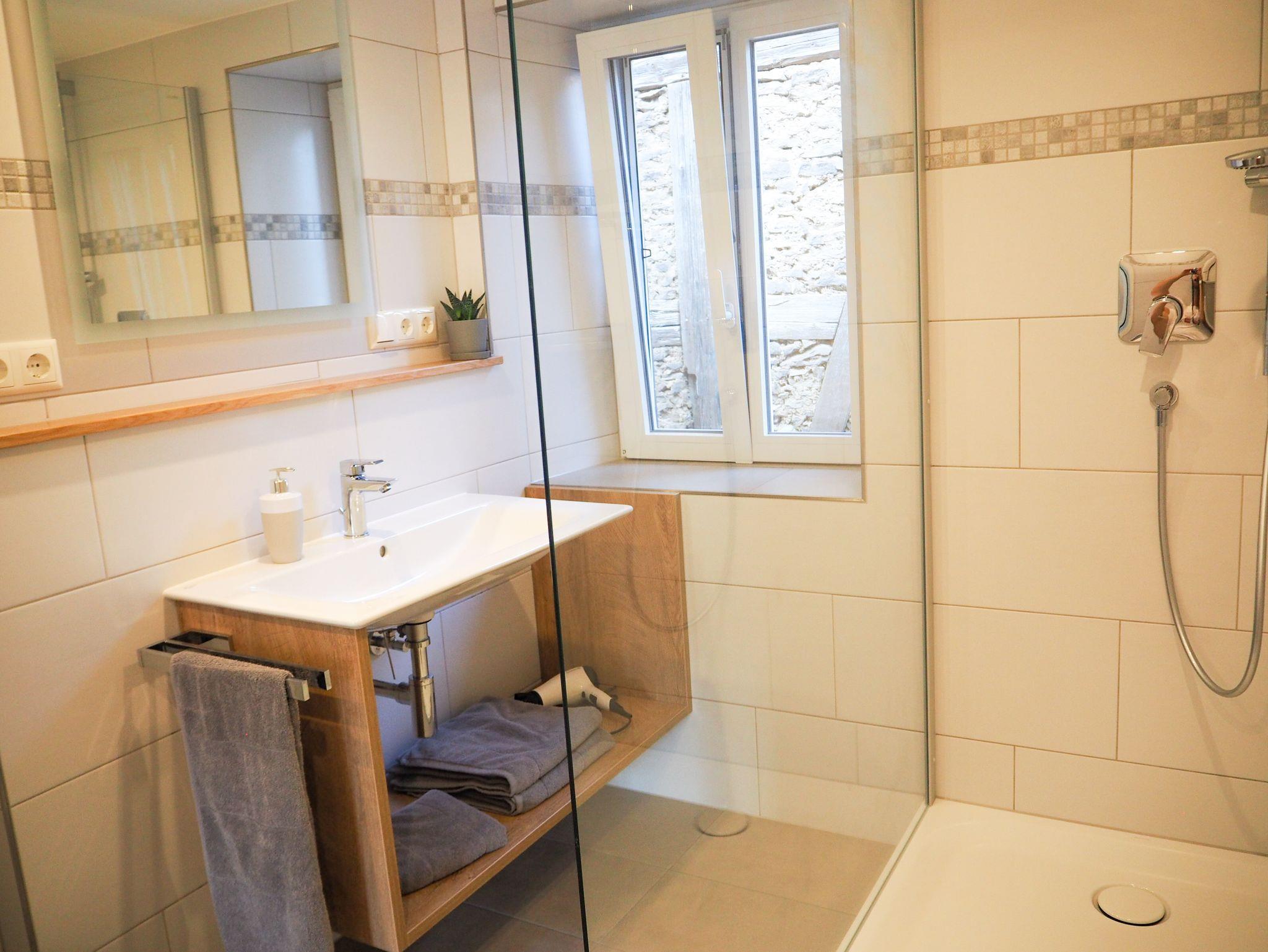 Im Bad befindet sich eine begehbare Dusche, Waschbecken und WC.