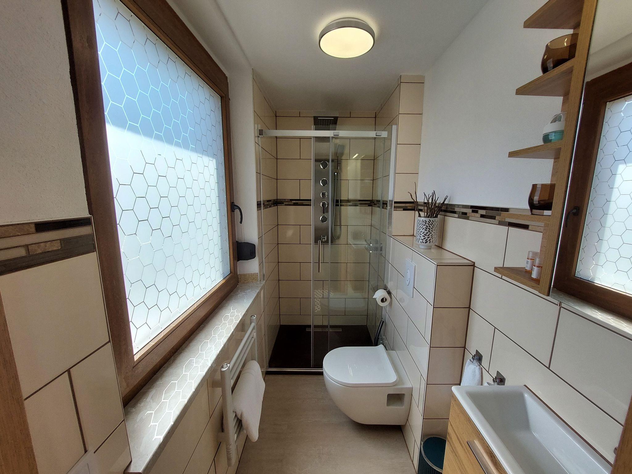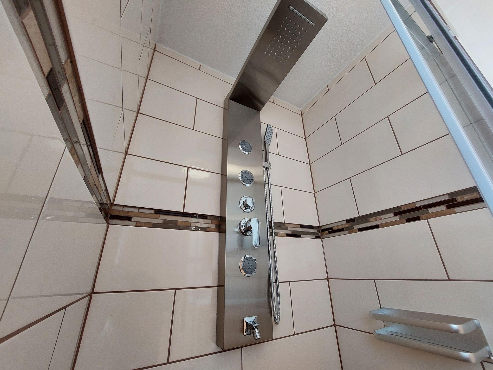 Das Bad ist mit großer Wellnessdusche mit Multifunktionsduschsäule (Massagedusche, Regendusche, Wasserfall, Handbrause, Fußdusche), WC, Waschbecken, Handtuchtrockner und Haarföhn ausgestattet.