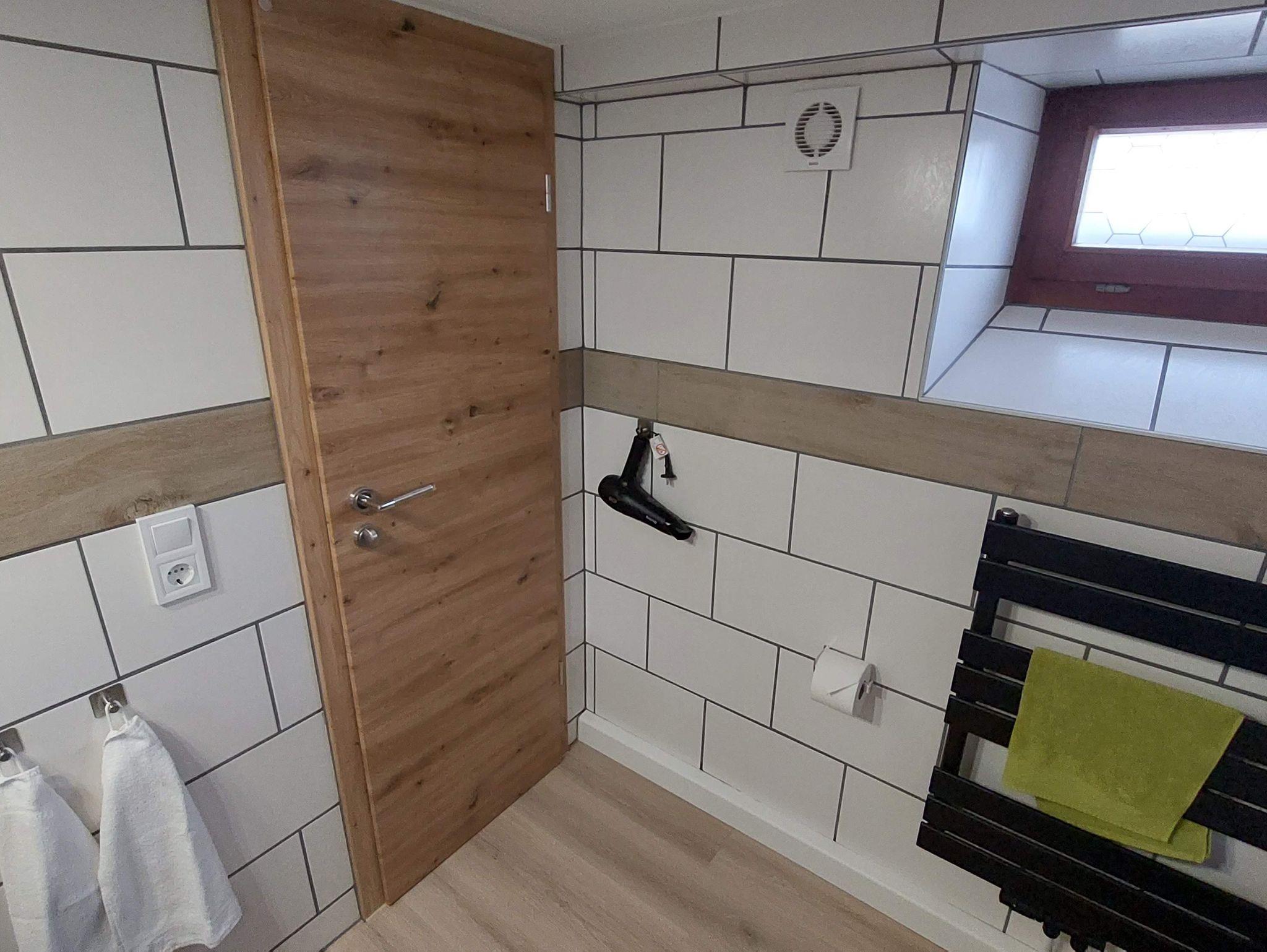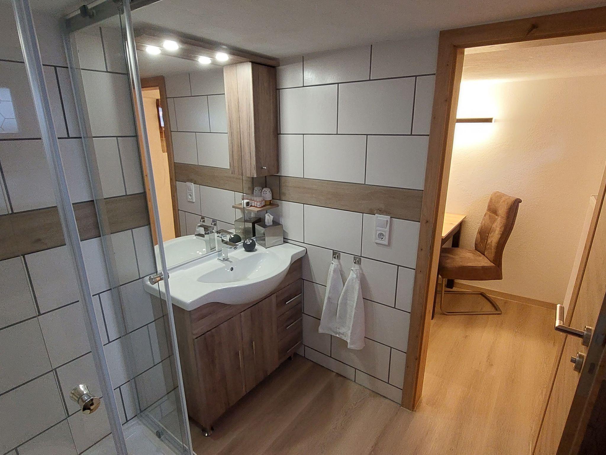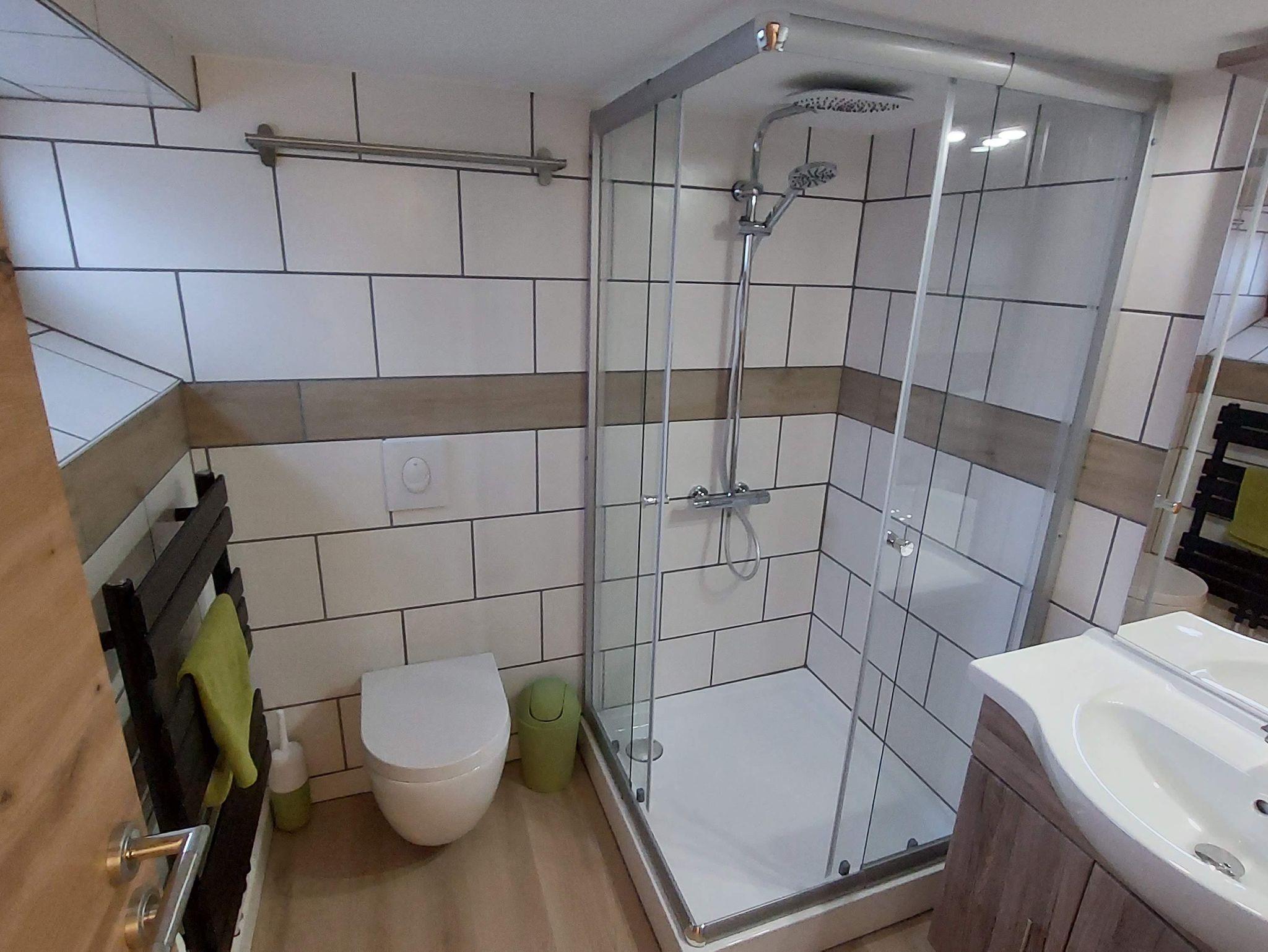 Das Bad ist mit Regendusche 90x90cm, WC, Waschbecken, Handtuchtrockner und Haarföhn ausgestattet.