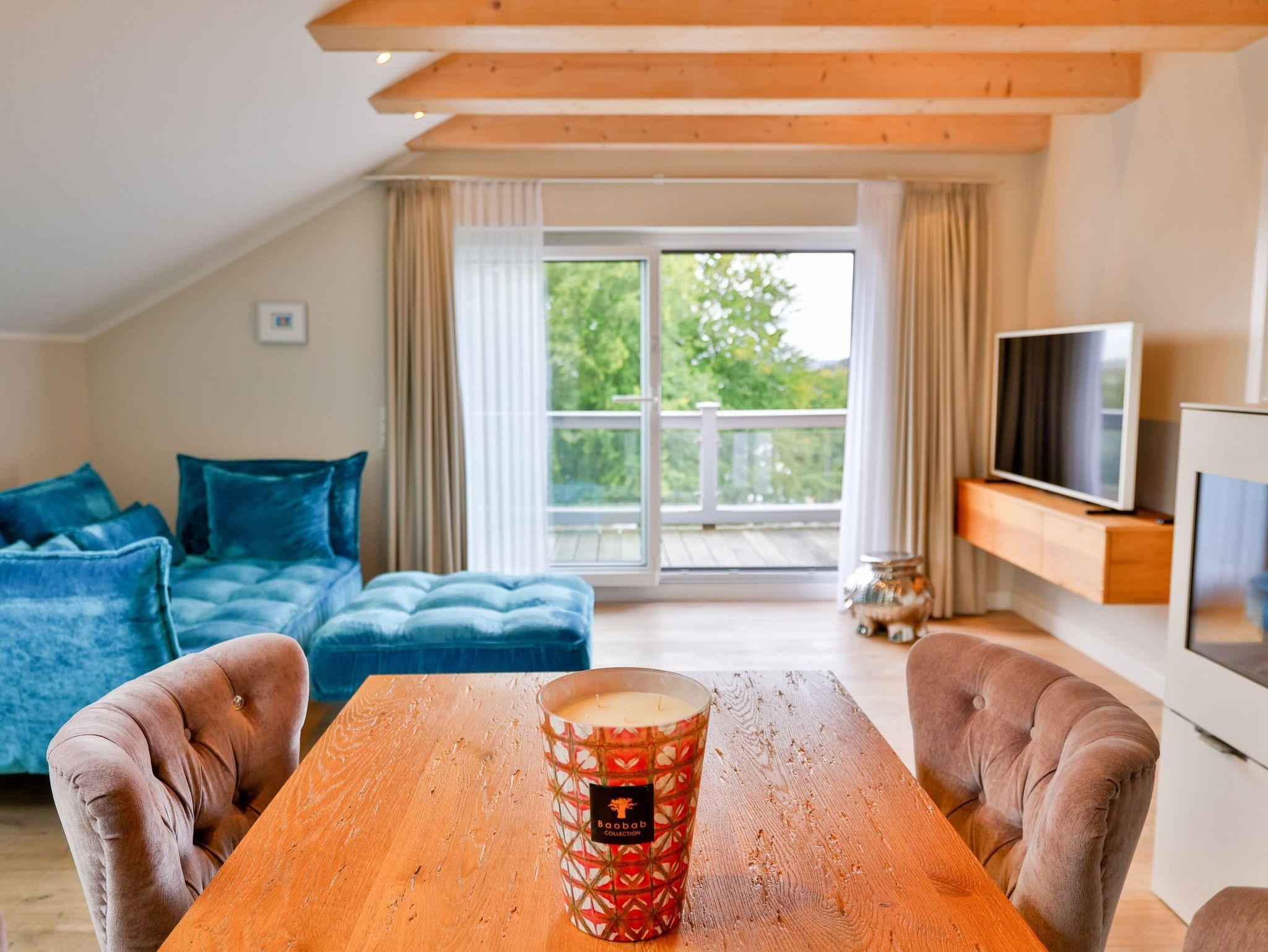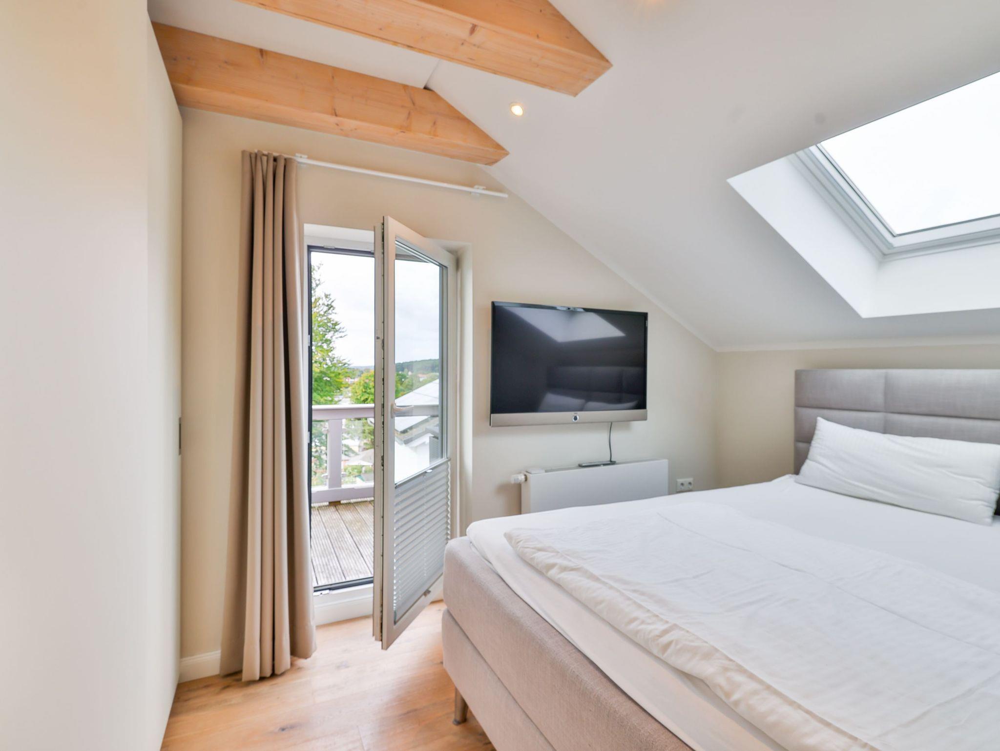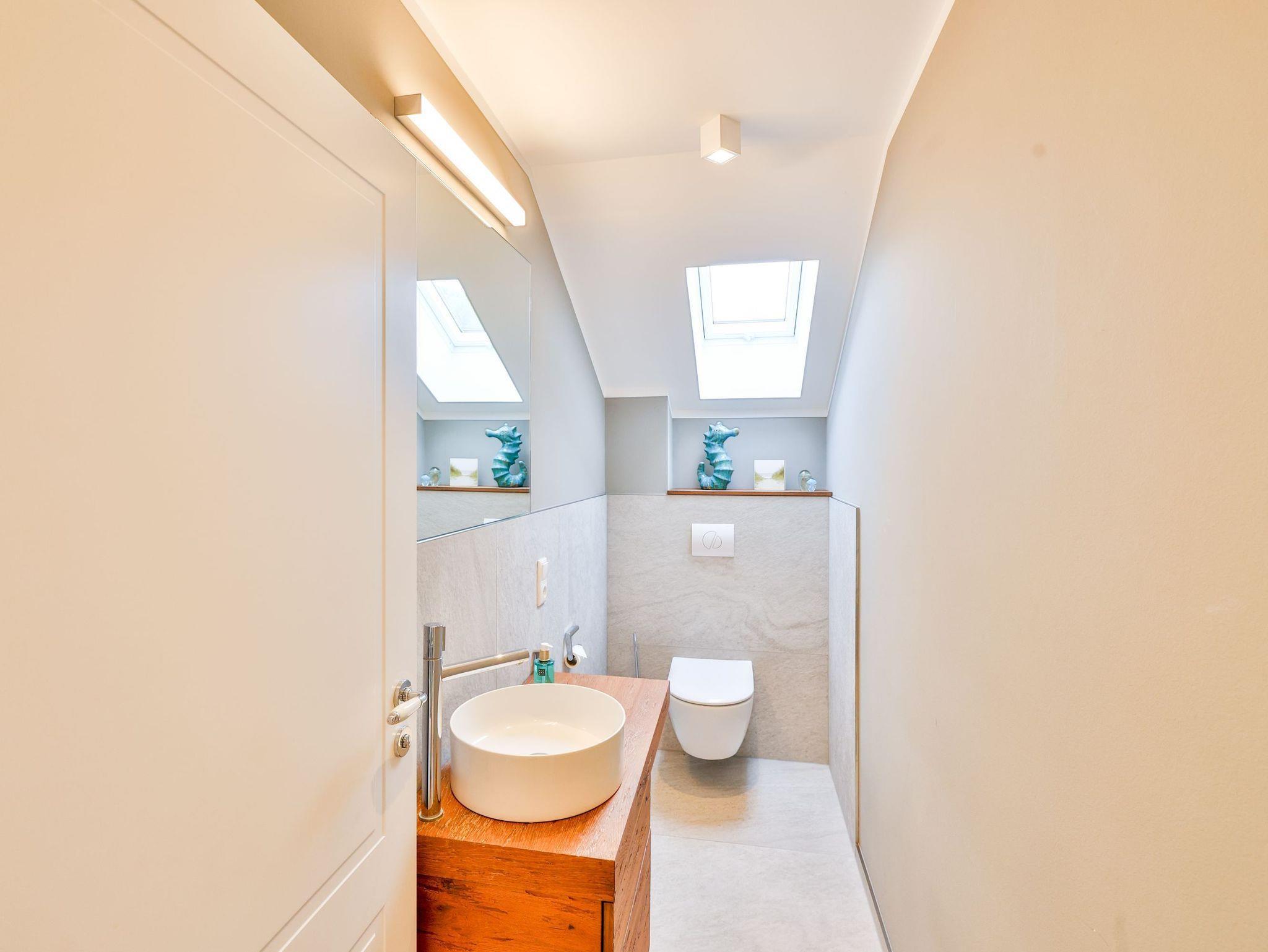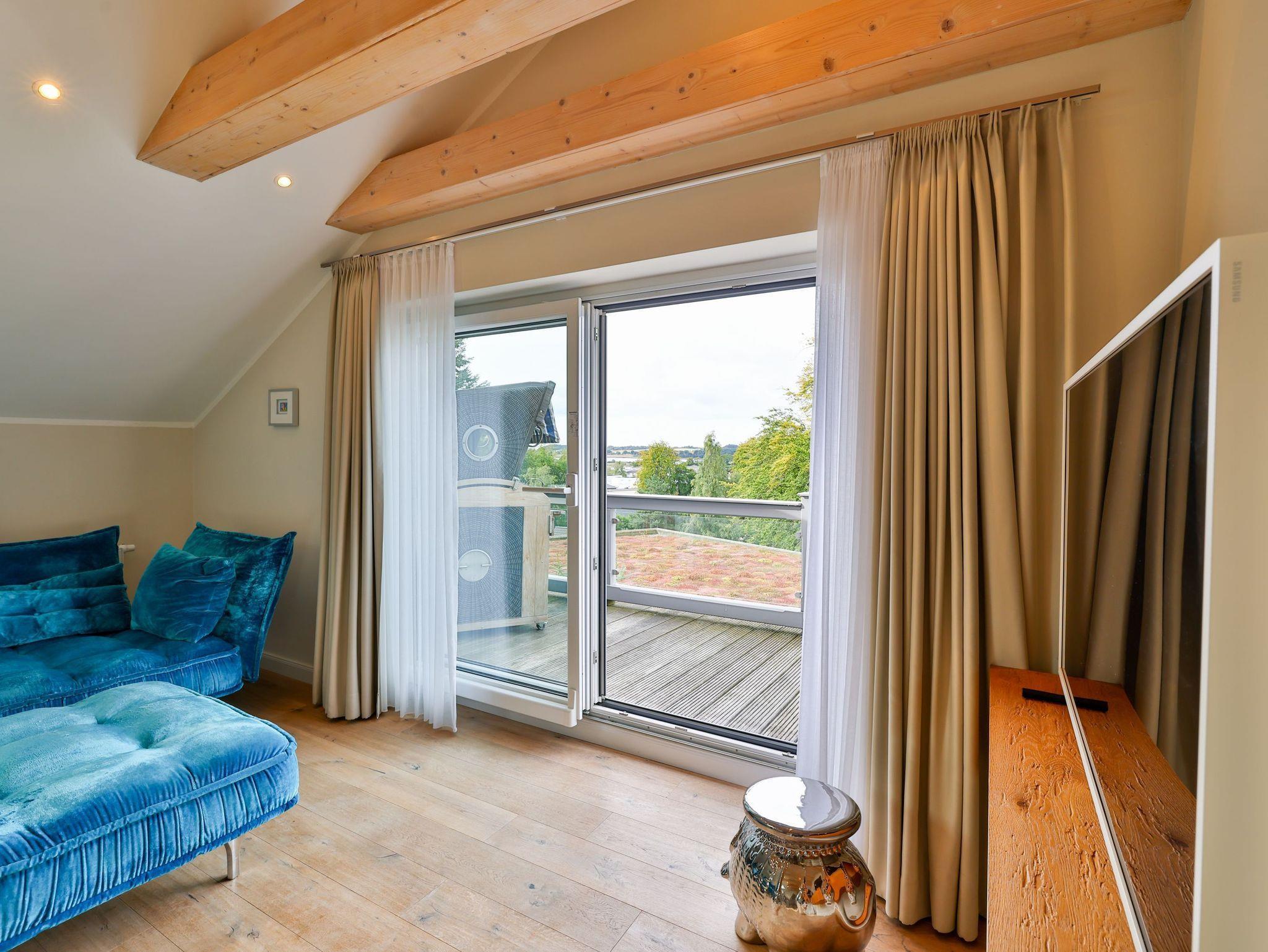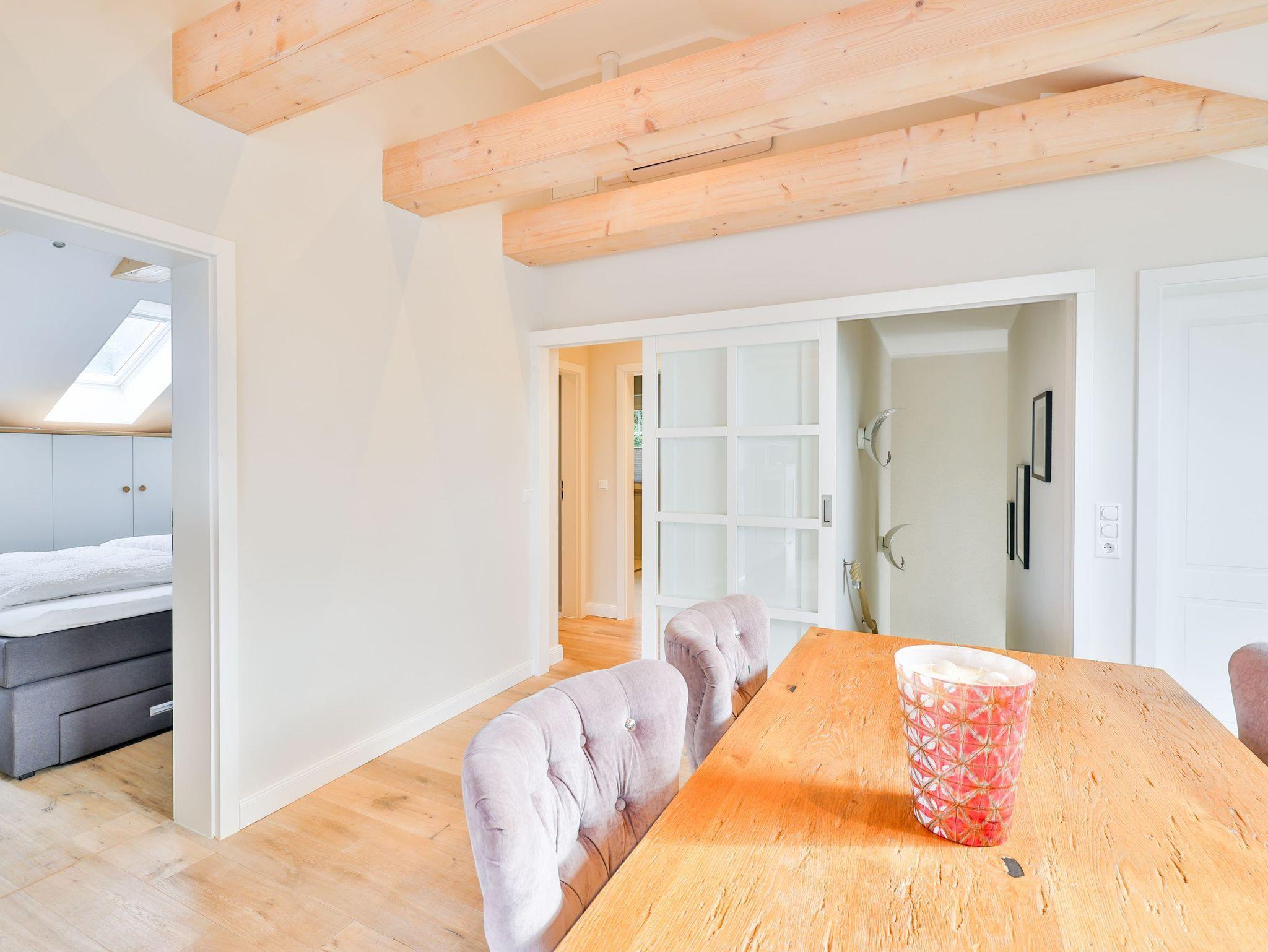 Die Ferienwohnung liegt im Obergeschoss. Sie erreichen die Urlaubsunterkunft durch einen separaten Eingang mit Treppenhaus. Der offene Wohn- und Essbereich, die 2 Schlafzimmer und der Hauswirtschaftsraum sind mit Parkettboden ausgestattet. Die Schlafzimmer verfügen über ein Boxspringbett. Eines der Schlafzimmer hat einen direkten Zugang zum Balkon. Das exklusive Badezimmer ist mit einer Sauna, einer offenen Dusche, einem Doppelwaschtisch und Fliesen in Großformat ausgestattet. Das WC mit einem zusätzlichen Waschtisch befindet sich in einem separaten Raum. Der Wohn- und Essbereich verfügt über eine vollausgestattete Küchenzeile, offener Balkenlage, einem Kaminofen, Essbereich und gemütlichem Sofa der Marke Bretz. Vom Wohnbereich gelangen Sie auf den Balkon mit Panoramablick über den Dächern des Ostseebad Sellin. Im Hauswirtschaftsraum befindet sich eine Waschmaschine und ein Trockner. Die Ferienwohnung verfügt über 2 PKW Stellplätze (im Preis inkl.).