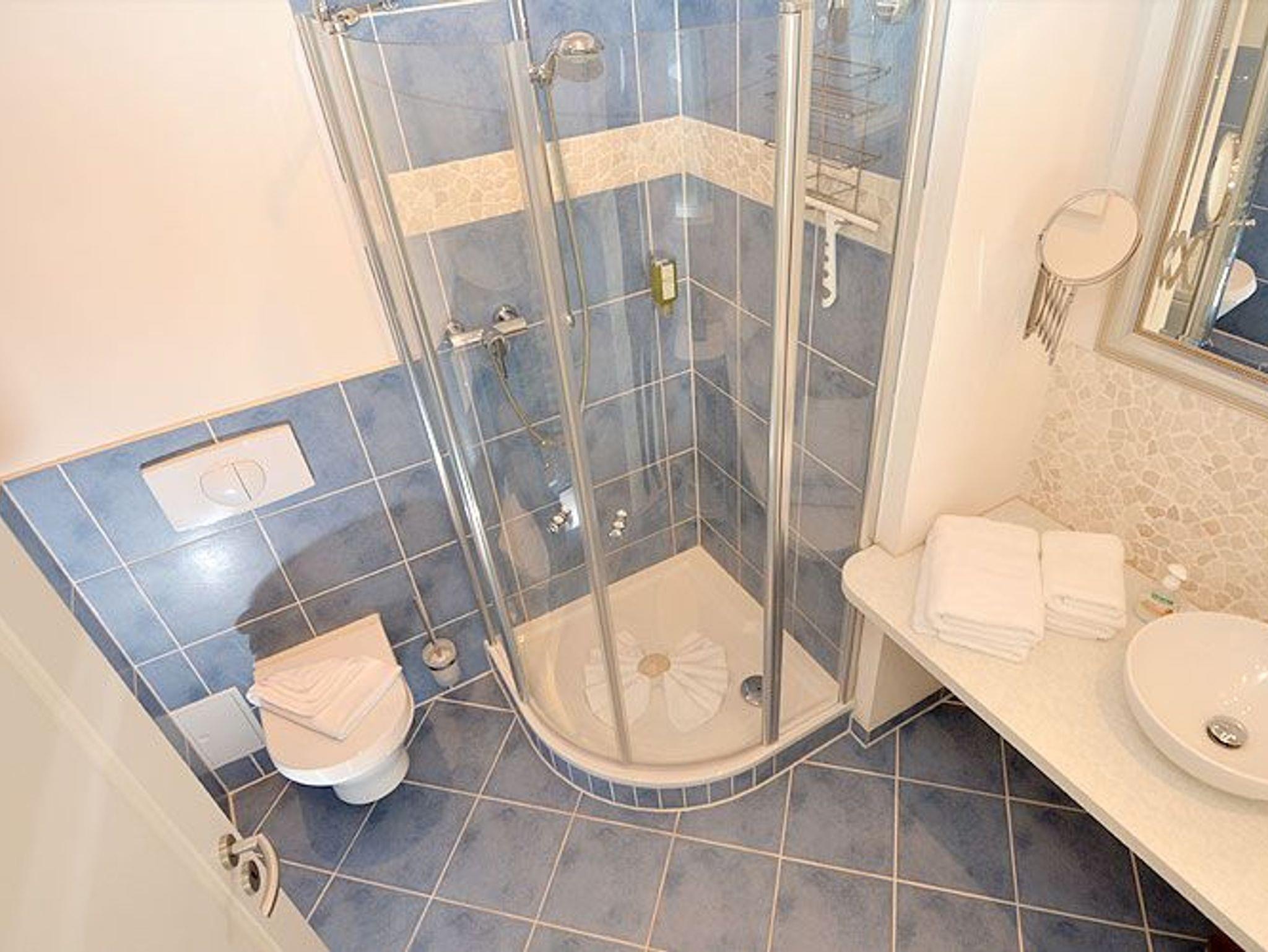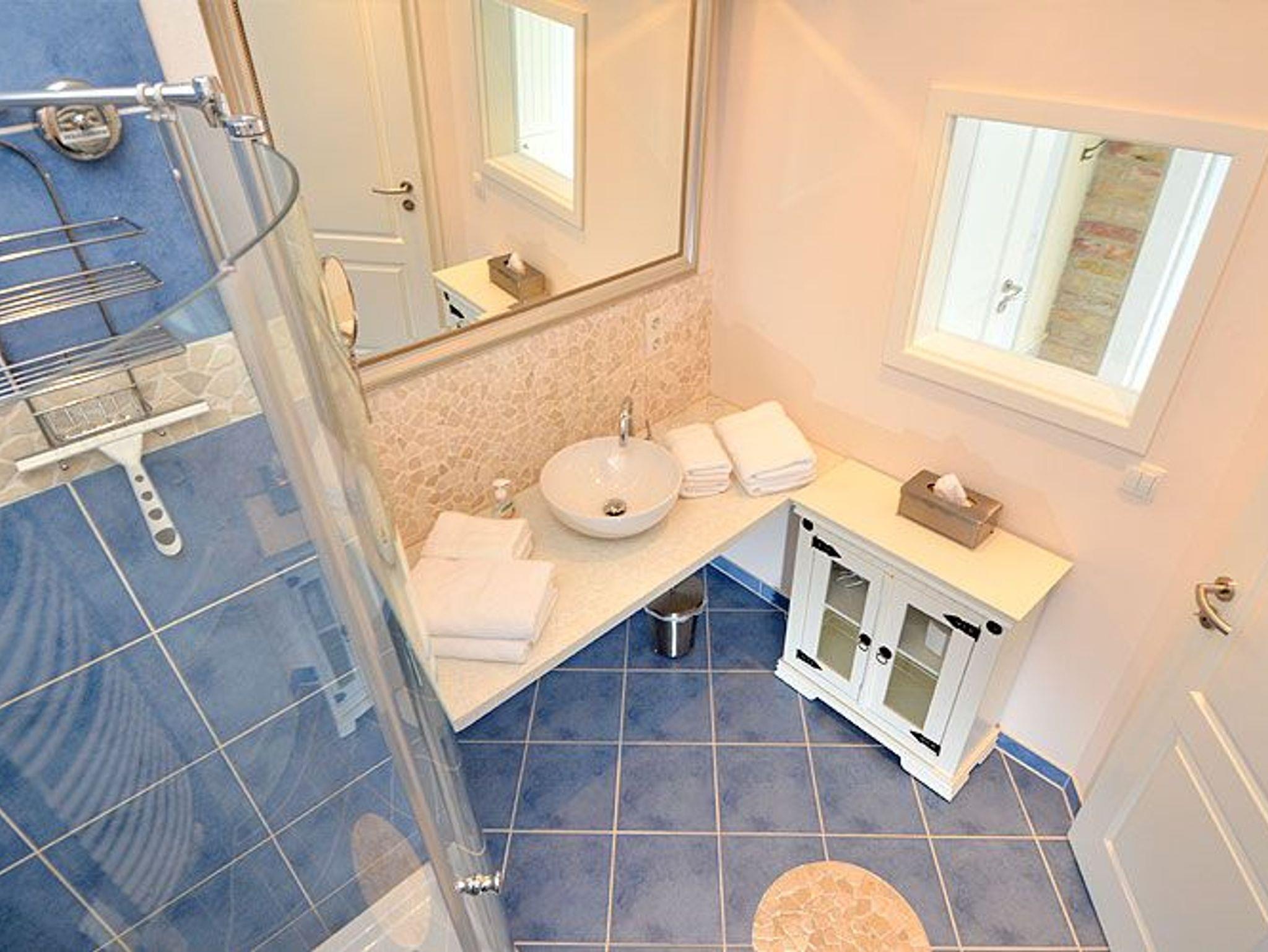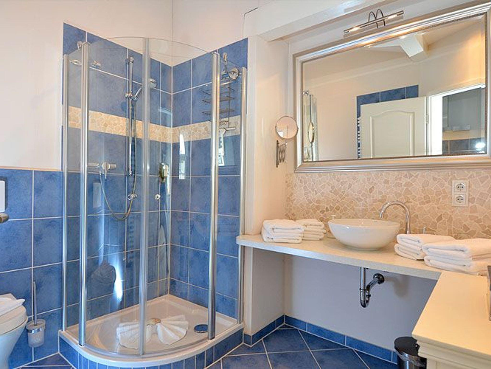 Ein modernes Duschbad mit WC, Waschbecken, Handtuchheizung und Fußbodenheizung rundet den hervorrasgenden Gesamteindruck dieser Ferienwohnung in Sellin ab.