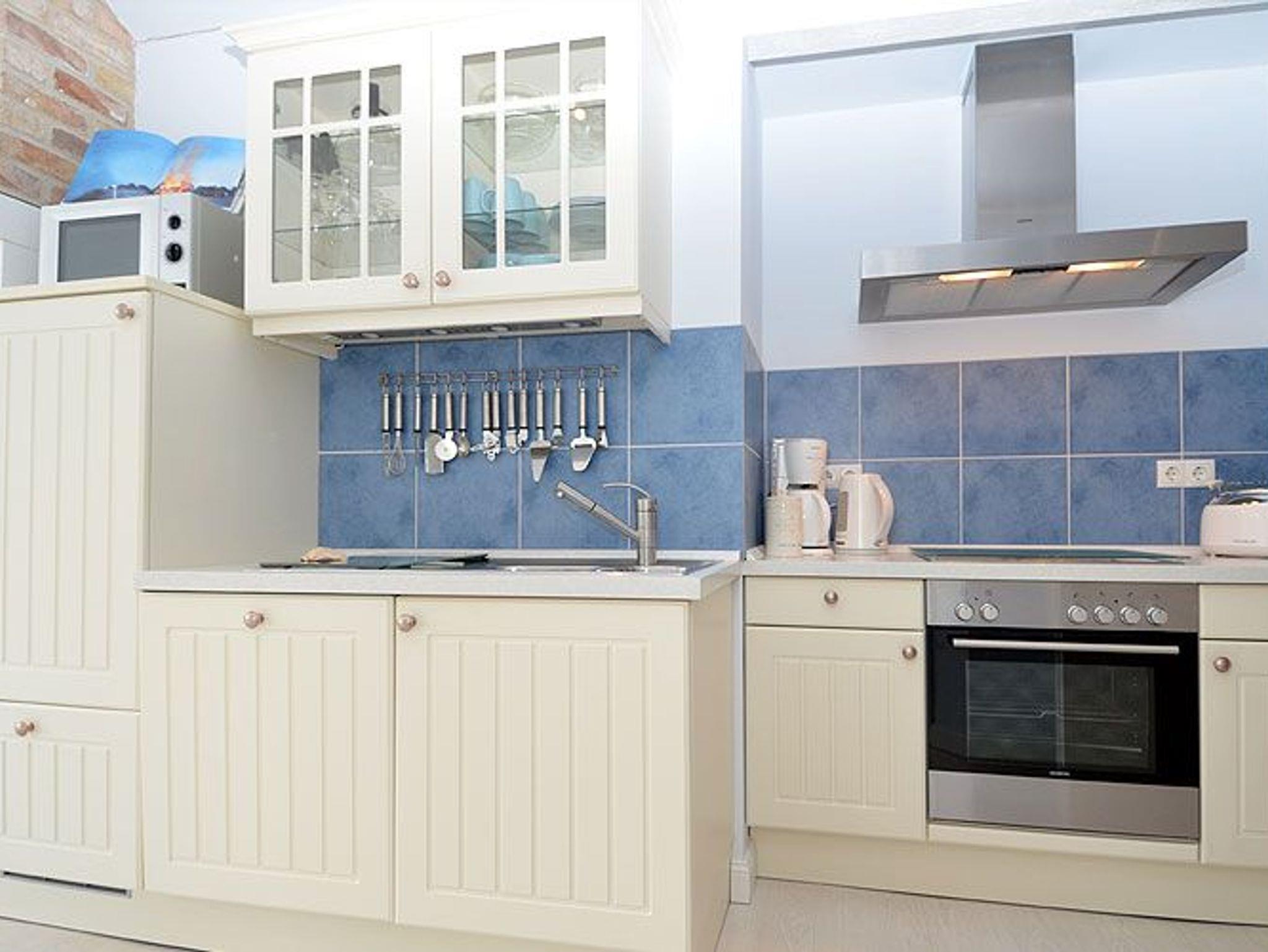 Die Landhausküchenzeile lässt keine Wünsche offen. Hier finden Sie einen Kühlschrank mit Gefrierfach, einen Backofen, ein 4 Platten-Ceranfeld, eine Spülmaschine, sowie Mikrowelle, Toaster, Mixer, einen Eierkocher und diverses Kleininventar, das die Küchenausstattung komplettiert. Der JURA-Kaffeeautomat sorgt auf Knopfdruck für Kaffee satt.